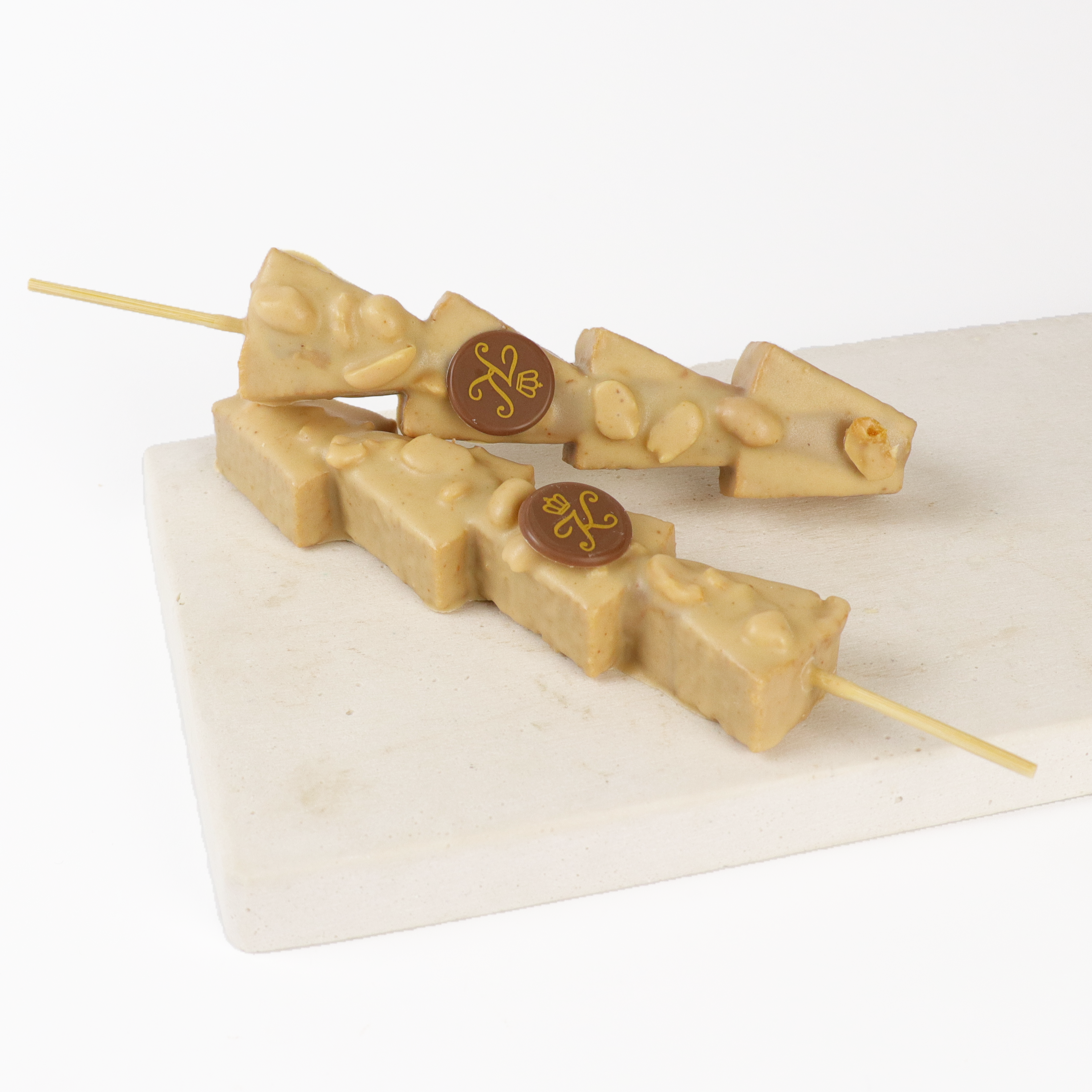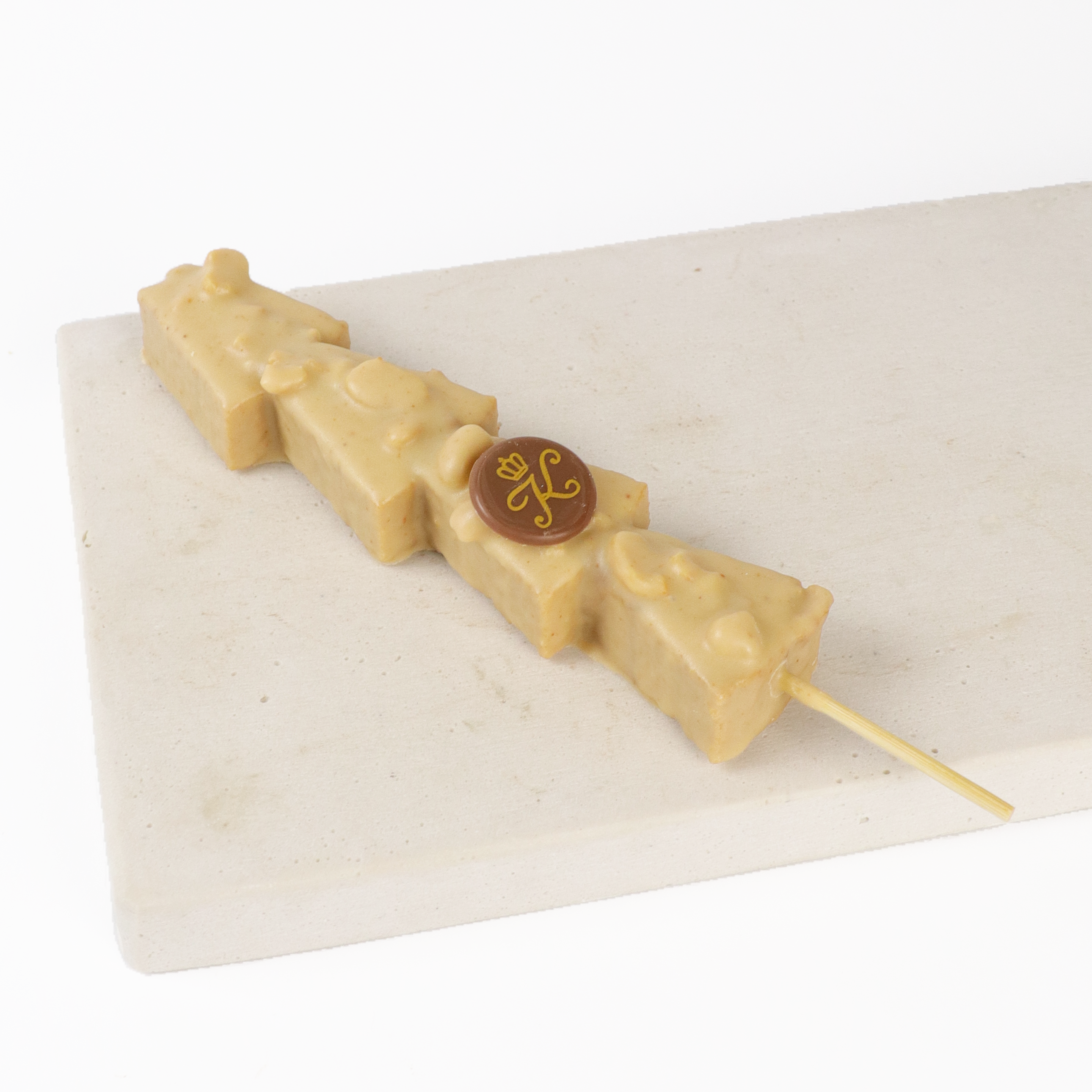 Für diese besondere Variante unserer Baumkuchenspitzen wird der Teig mit feiner Erdnussbutter veredelt und Schicht für Schicht vor offener Flamme gebacken. Eine feine Karamellschicht und geröstete Erdnüsse unter der zarten Glasur sorgen für ein köstliches Zusammenspiel aus süß, salzig und nussig. Auf einem Holzspieß angerichtet, sind die kleinen Baumkuchenspitzen das perfekte Confiserie-Erlebnis für zwischendurch oder zum Verschenken.