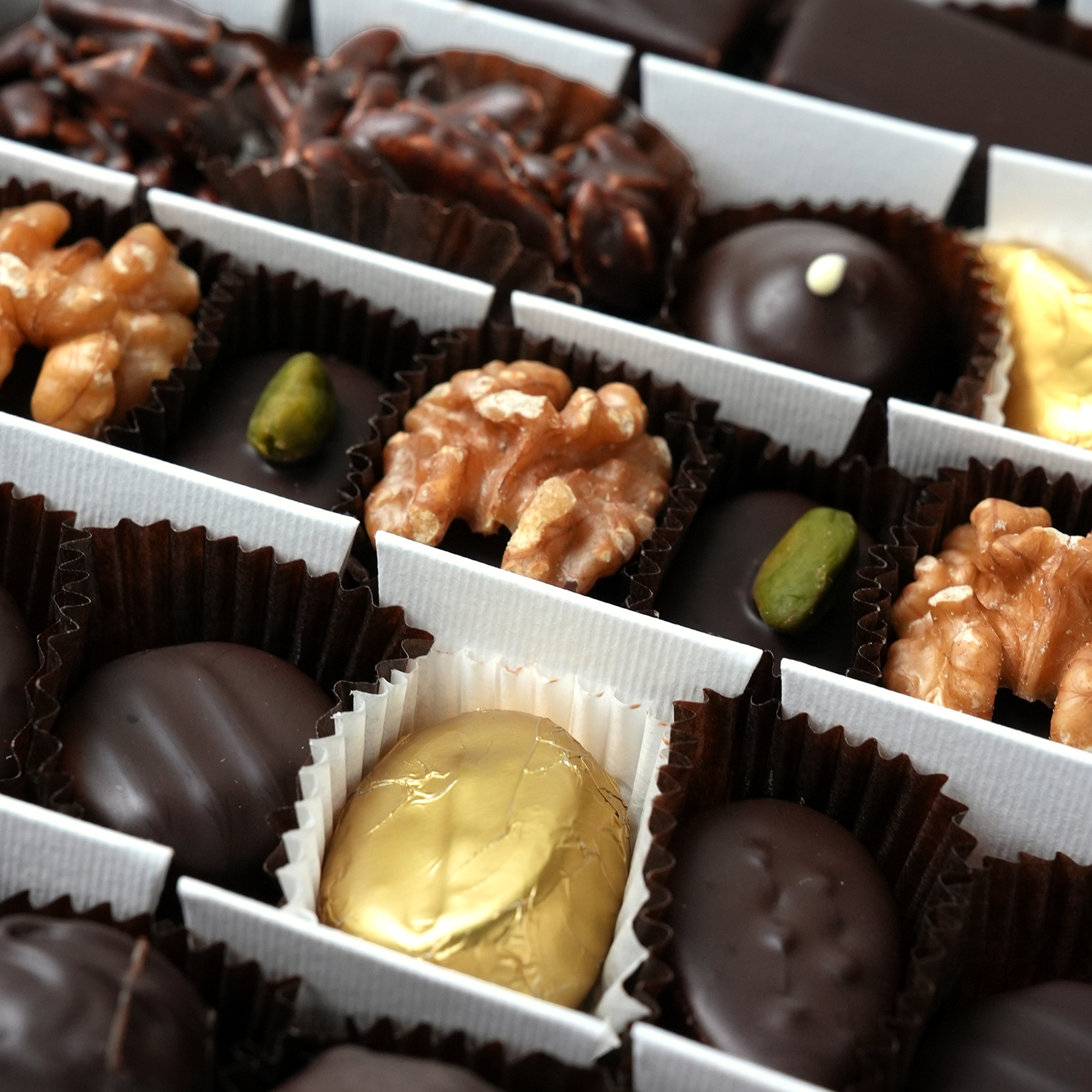 Unsere Pralinen werden in traditioneller Konditorkunst gefertigt – mit Sorgfalt, Fingerspitzengefühl und besten Zutaten. Die dunkle Kuvertüre umhüllt ausgewogene Füllungen: fruchtig, nussig oder mit edlem Alkohol verfeinert. Ein Genuss für anspruchsvolle Gaumen.