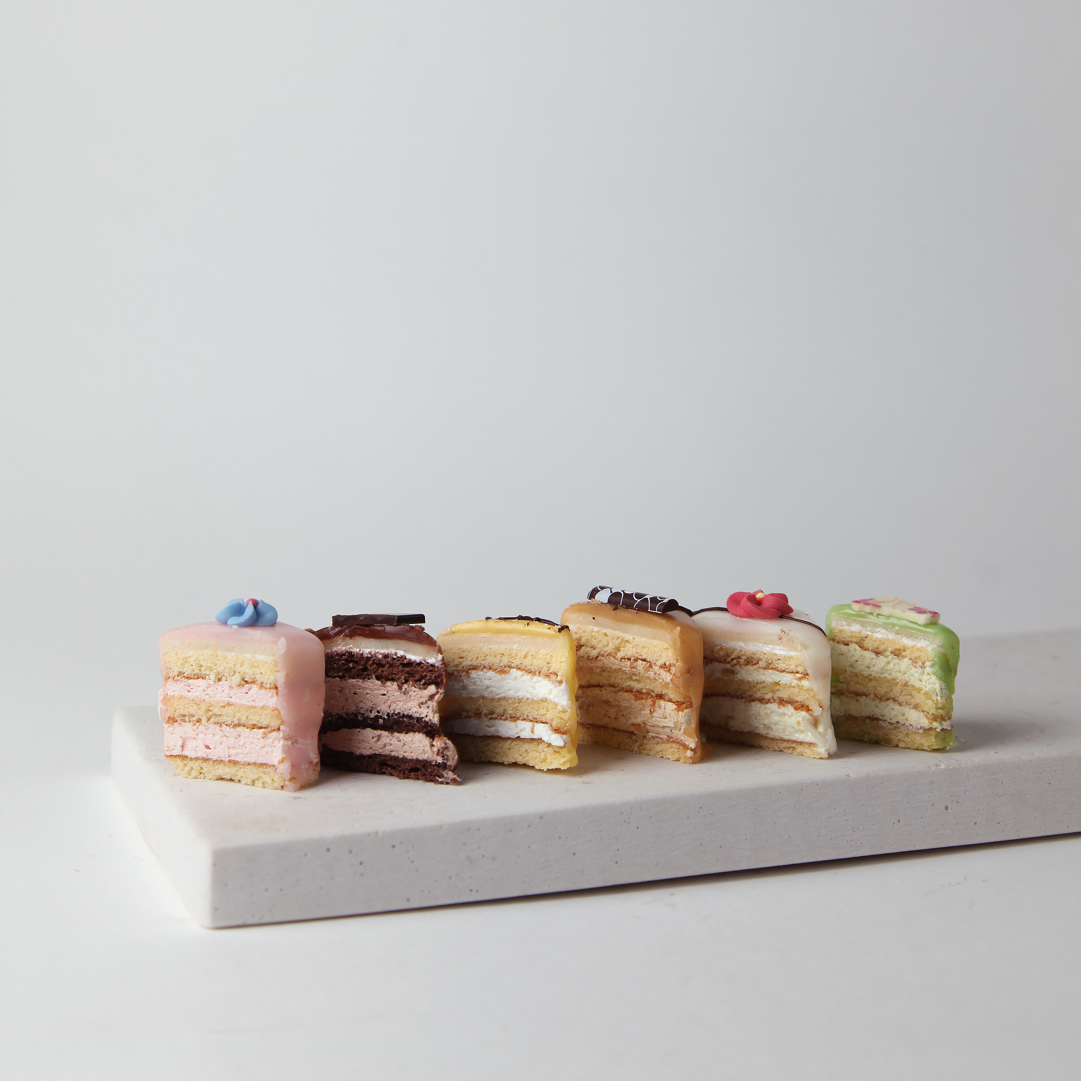 Sugar, wheat flour, hen's egg, butter, vegetable fat, invert sugar, marzipan, almonds, chocolate couverture, cocoa, mocha extract, orange paste, rum, lemon, arrack, Grand Marnier, maraschino, amaretto, colorants: yellow (E160a, E161b, E101, E171), green (E131, E172, E133), pink (E1600c, E120, E129) Decorative topping: thickener E414, digested milk protein, acidifier E330, carthamus extract, colorants: yellow (E100), red (E120), blue (E132), brown (E150d), orange (E160a), black (E172)