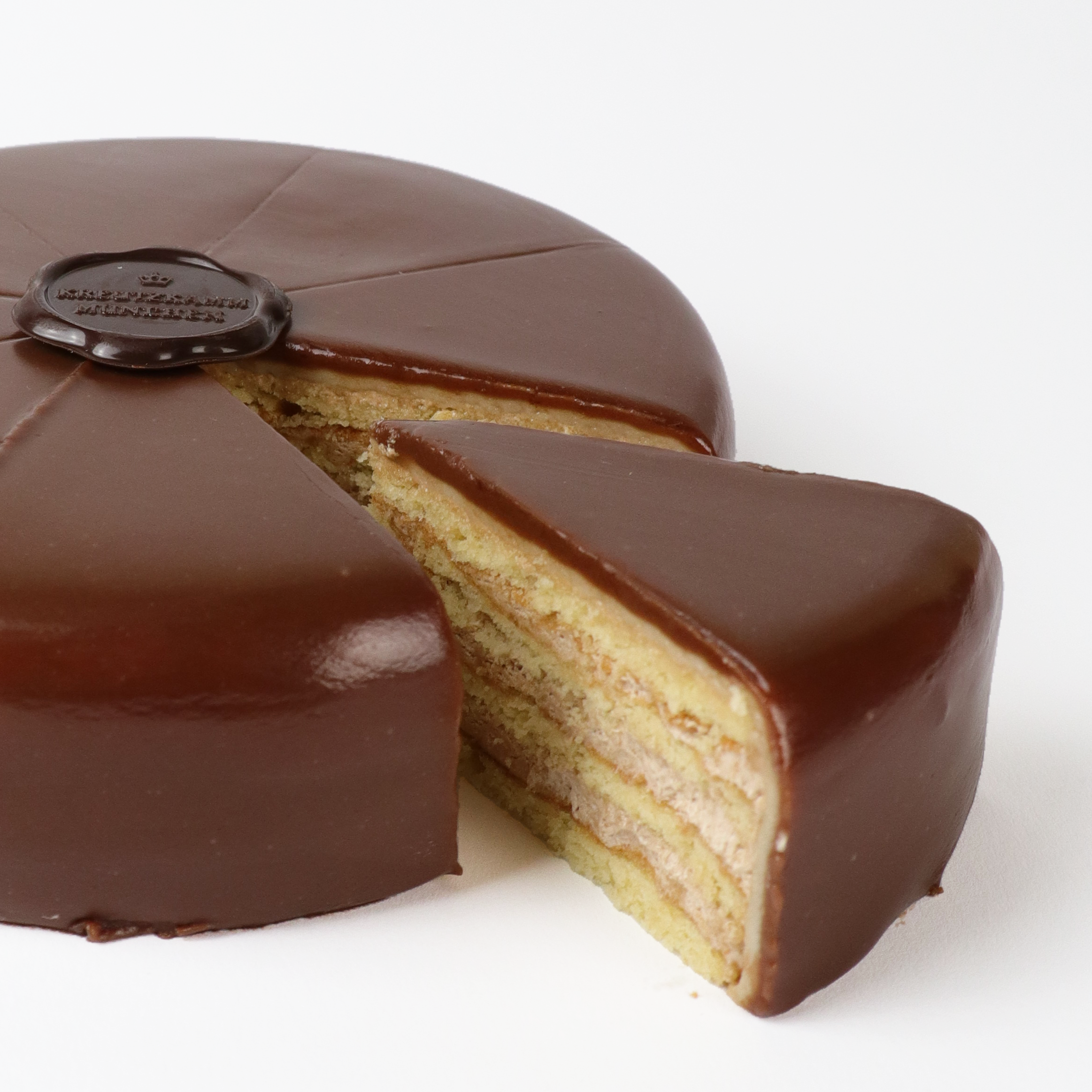 The Prinzregententorte is the pride of the Bavarian confectioners. It is named after Prince Regent Luitpold of Bavaria and is made from seven thin soils (based on the Bavarian administrative districts). Between the madeira layers and around the Prinzregententorte is chocolate buttercream. (without alcohol)