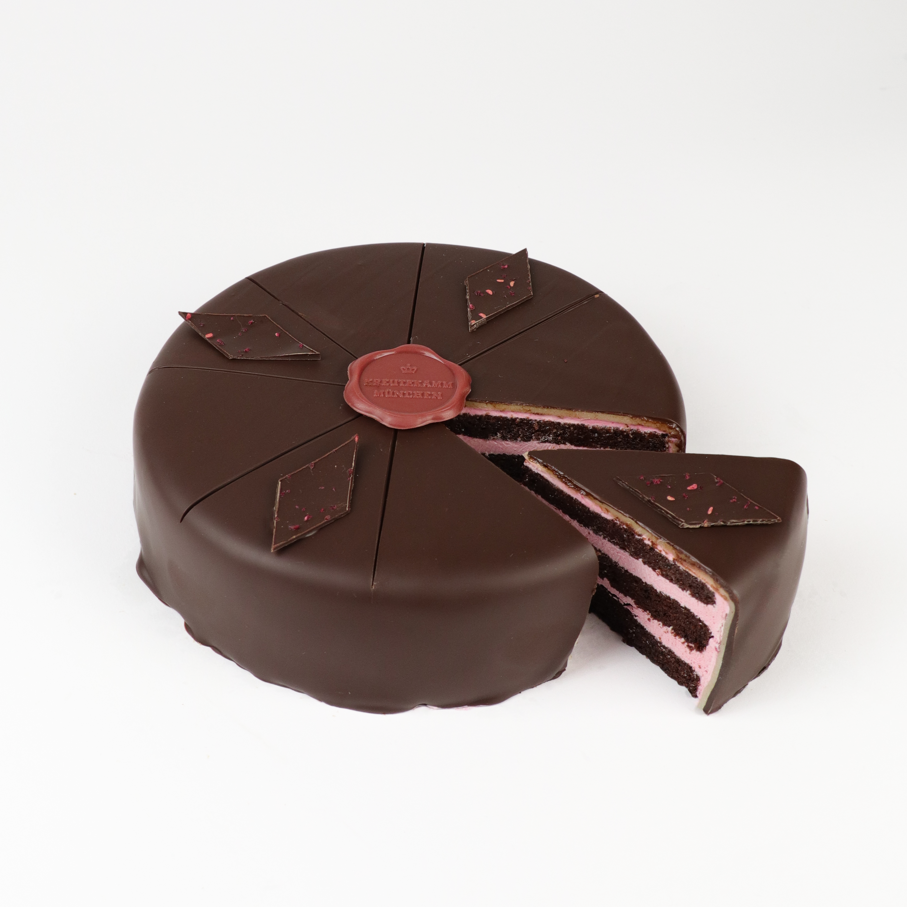 Between the vegan chocolate layers, the cake is filled with a vegan raspberry cream, covered with marzipan and vegan chocolate couverture. Even our raspberry colored Conditorei Kreutzkamm seal is of course vegan.