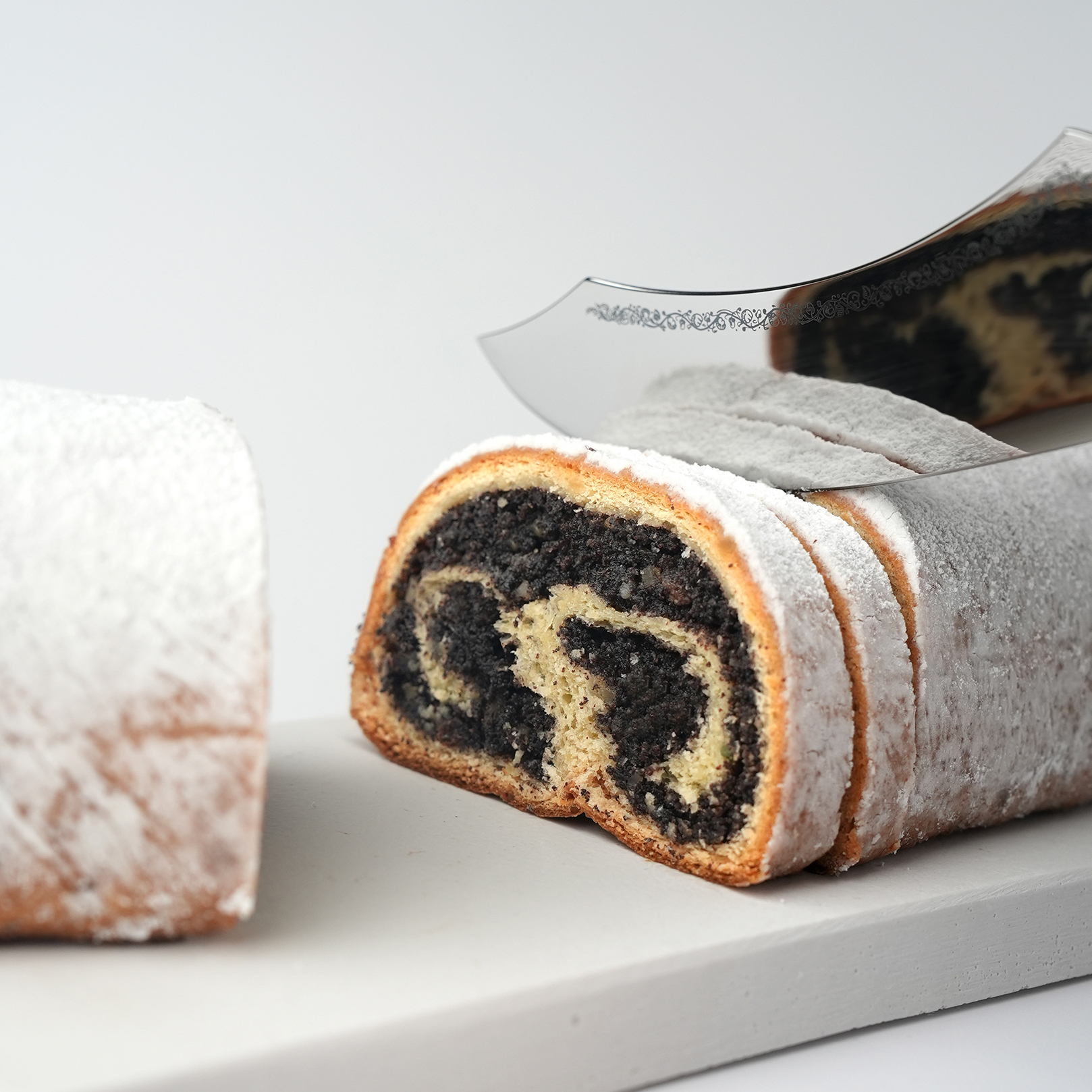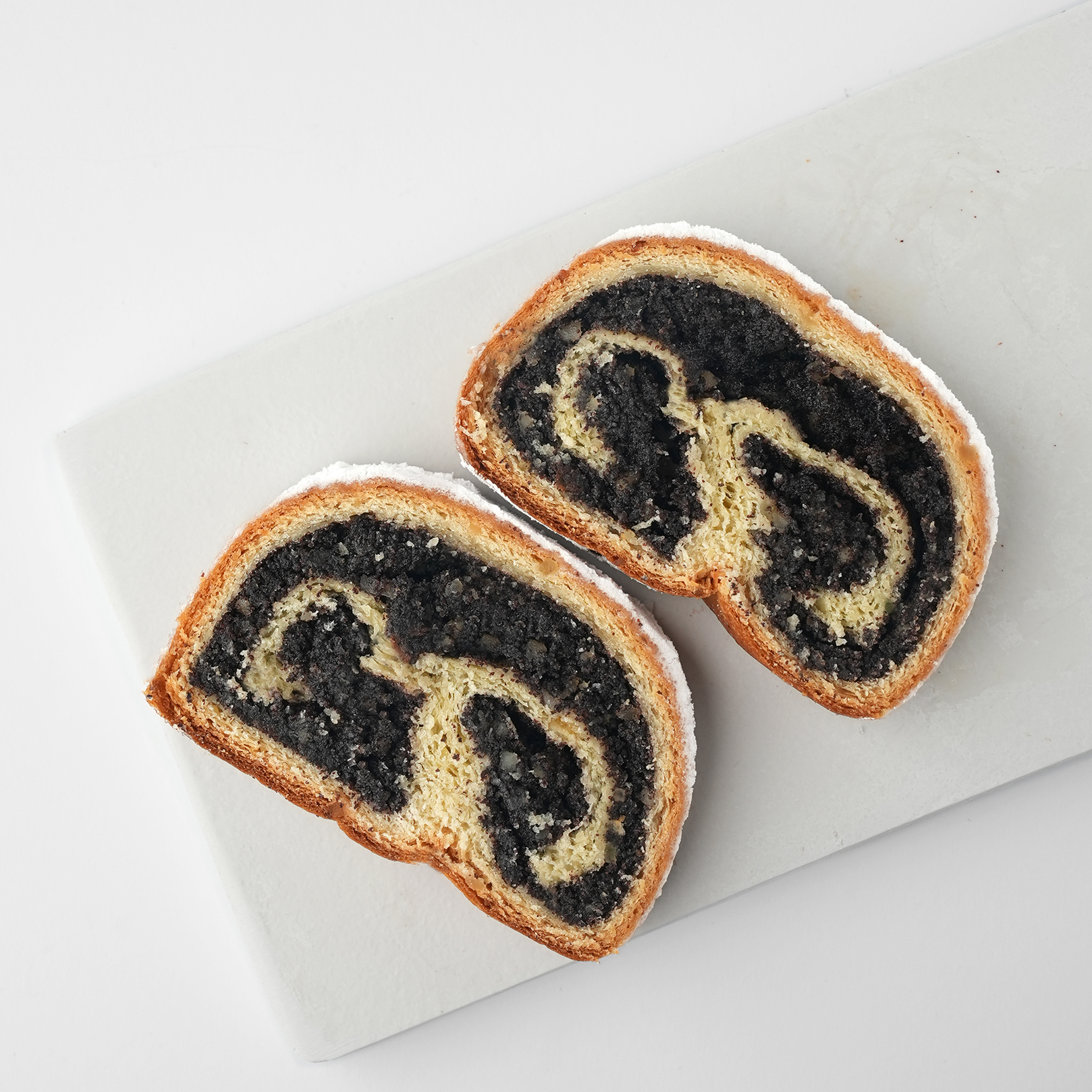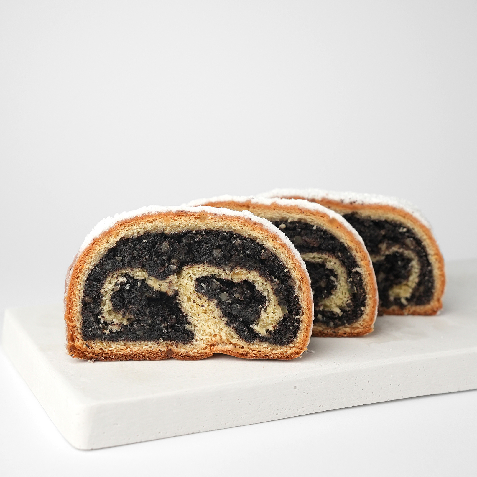 The poppy seed stollen are lovingly handmade and formed in a loaf. A thin layer of dough encloses the juicy poppy mass. Post baking, the poppy seed stollen is coated with pure brand butter and sugared. Those who like poppy seeds will love this stollen.