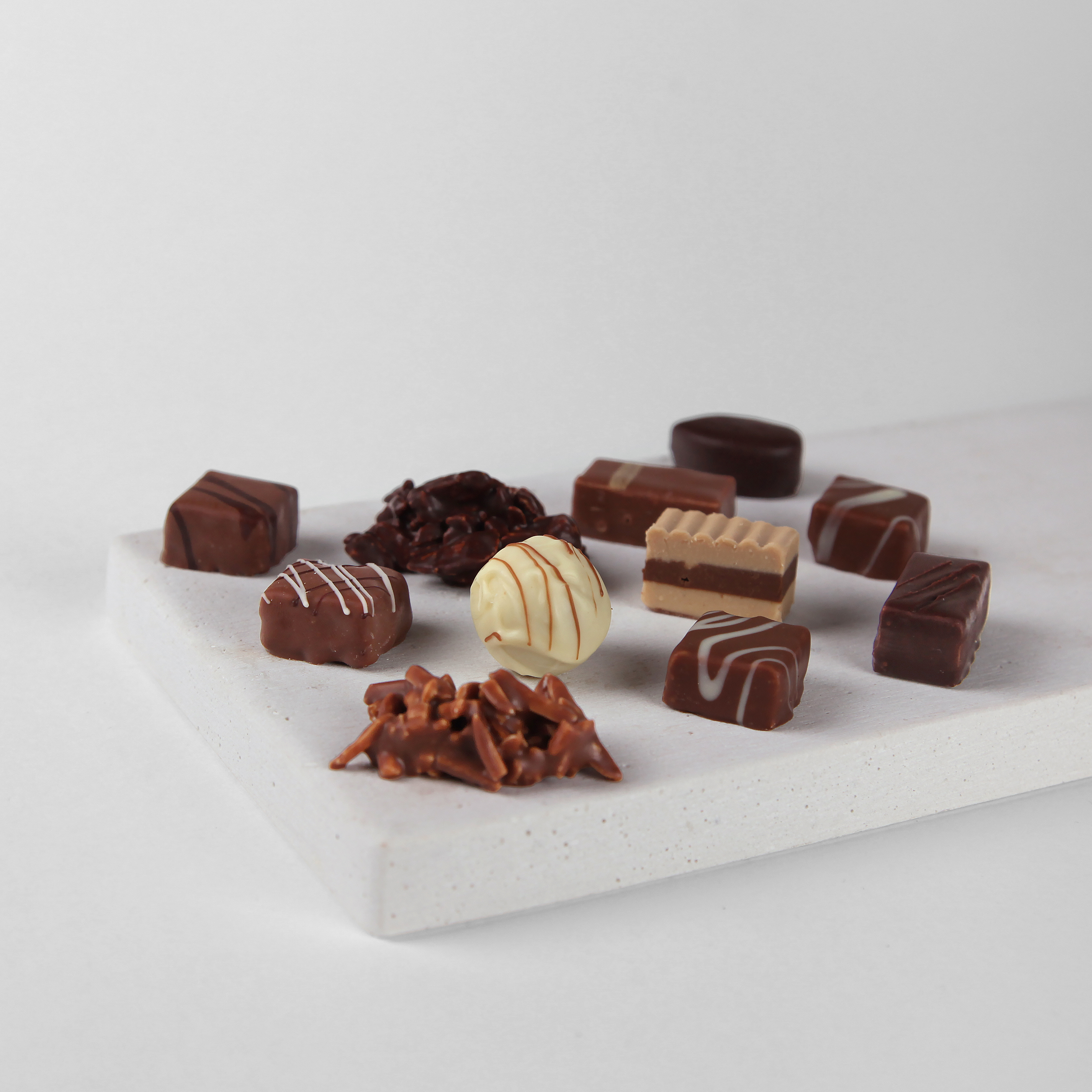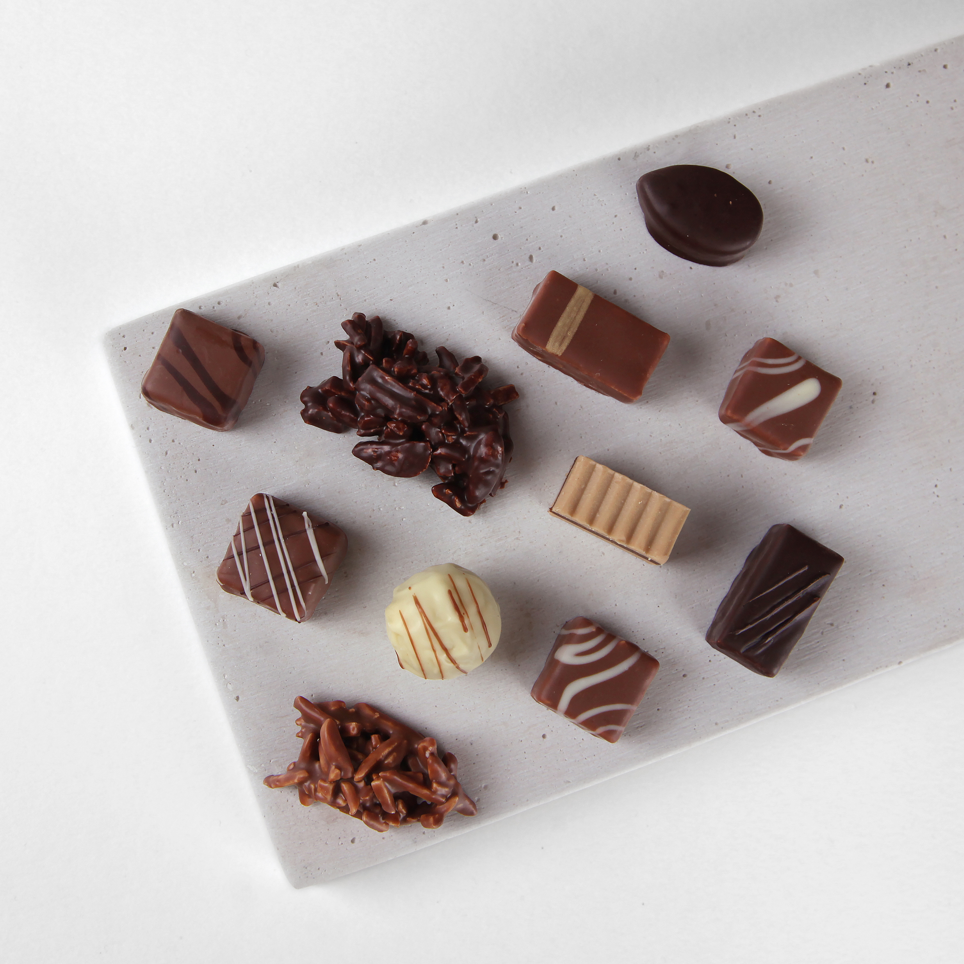 Splatter brittle, nougat pocket, dark marzipan, bitter nougat, almond nougat, walnut marzipan, Williams pear, orange marzipan, tea canache, almond slivers whole milk and & dark chocolate