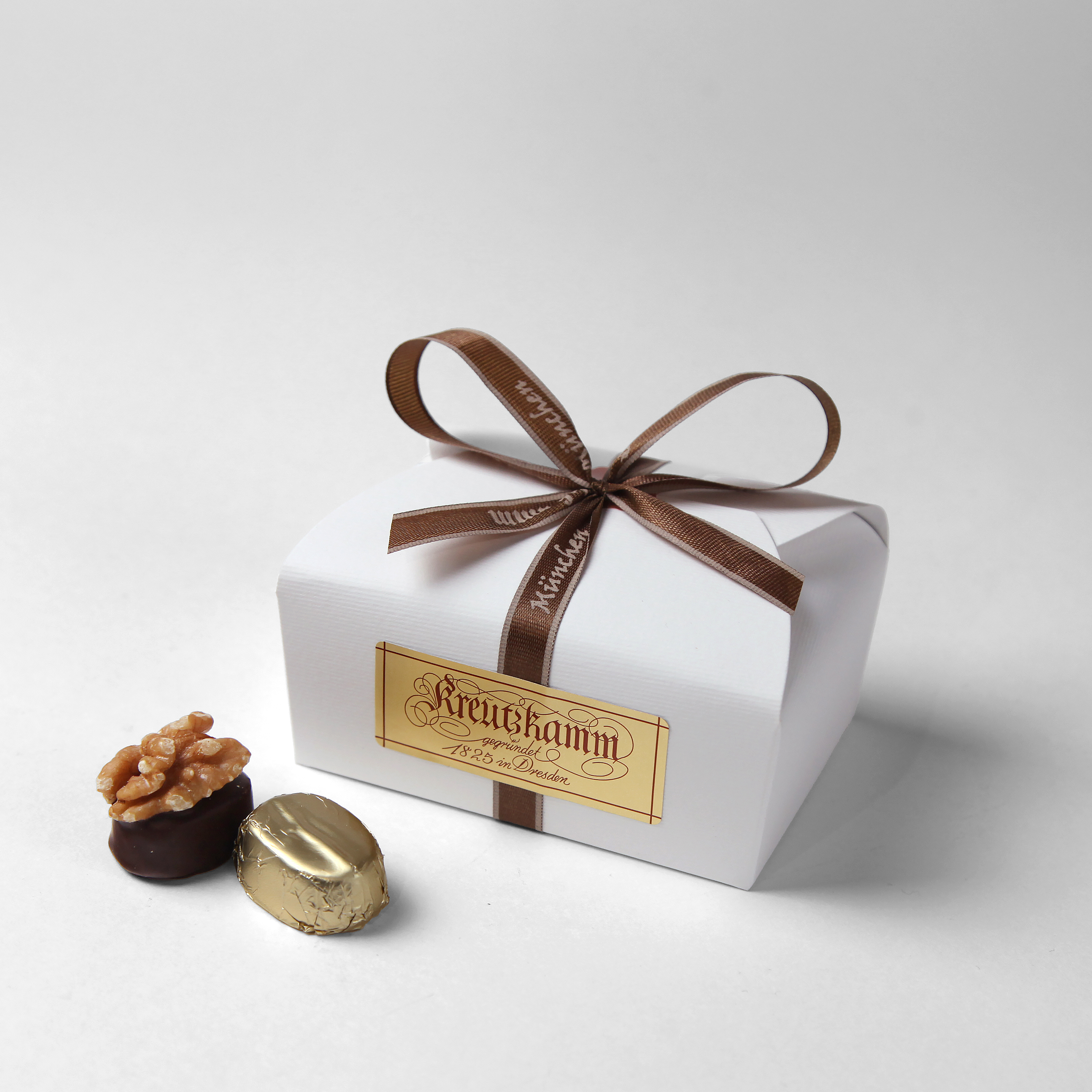 Edel-Schokoladenkuvertüre 63% (Kakaomasse, Zucker, Kakaobutter, Emulgator (Sojalecithin)), Marzipan (Mandeln, Zucker, Invertzucker), Vollmilchkuvertüre (Zucker, Kakaobutter, Vollmilchpulver, Kakaomasse, Emulgator (Sojalecithin), Vanilleextrakt), Zucker, Mandeln, Haselnuss, Sahne (enthält Milch) , Kakaobutter, Walnuss, Orangeat (Orangenschalen, Glukose-Fruktose-Sirup, Saccharose, Salz, Säuerungsmittel (Citronensäure)), Arrak, Kakaomasse, Schokoladenkuvertüre 63% (Kakaomasse, Zucker, Kakaobutter, Emulgator (Sojalecithin), Vanilleextrakt), Mandeln gehackt, Neutralalkohol, Jamaica Rum, schwarzer Tee, natürliches Aroma (Walnussmus, Zucker, natürliches Aroma, Palmfett, Emulgator (Sojalecithin)), Vanille, Williamsbirne, Glukosesirup, Birnenmark, Invertzuckersirup, Williams-Christ-Birnenbrand, Maisstärke, natürliches Aroma