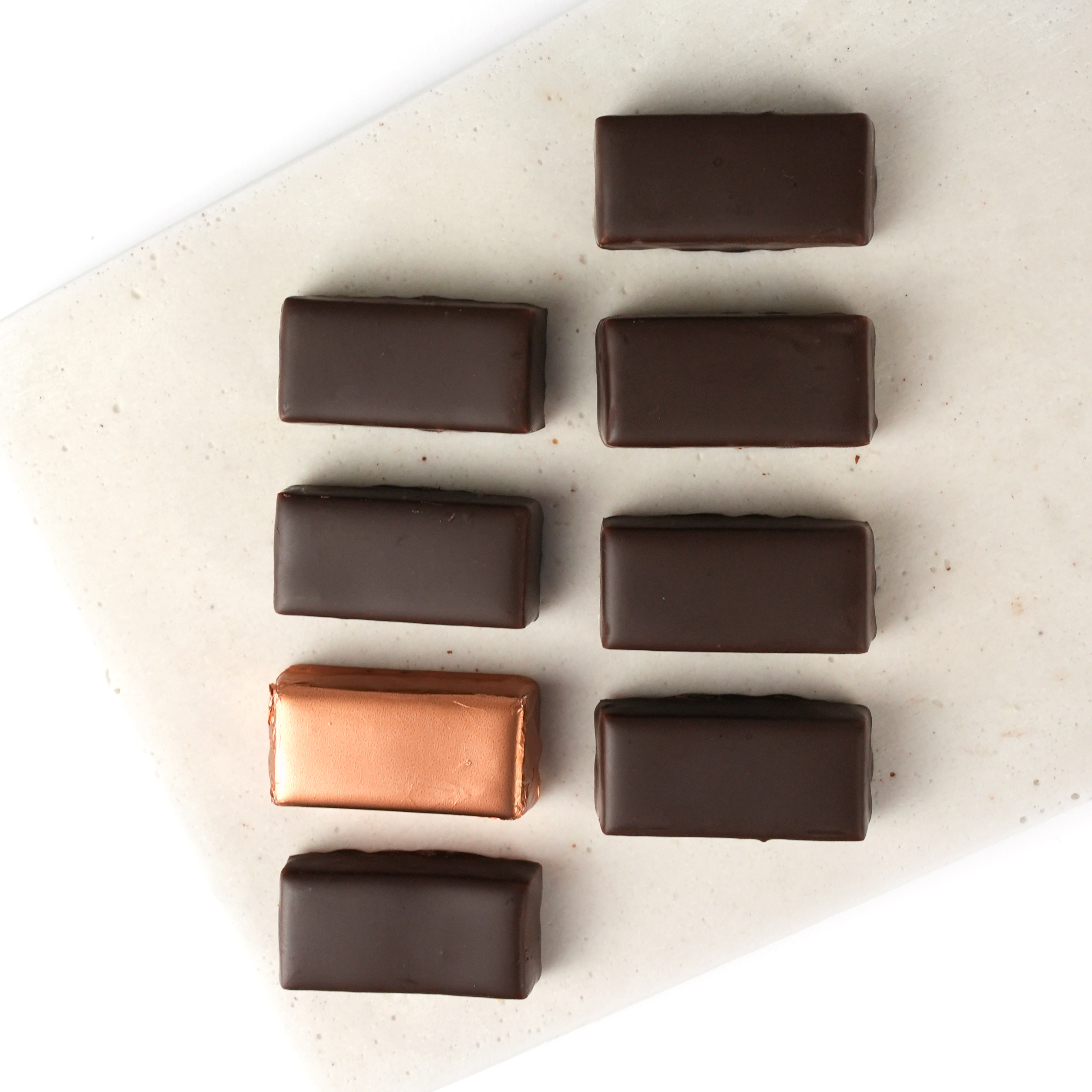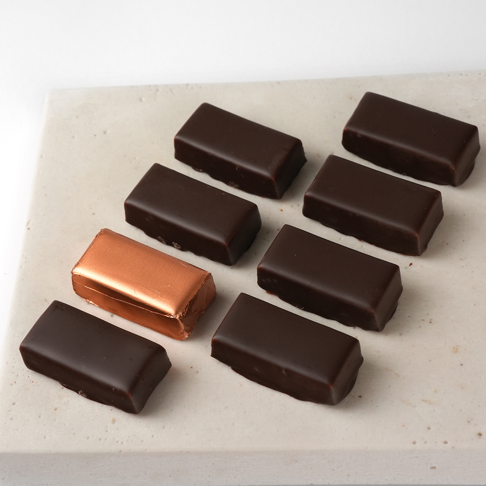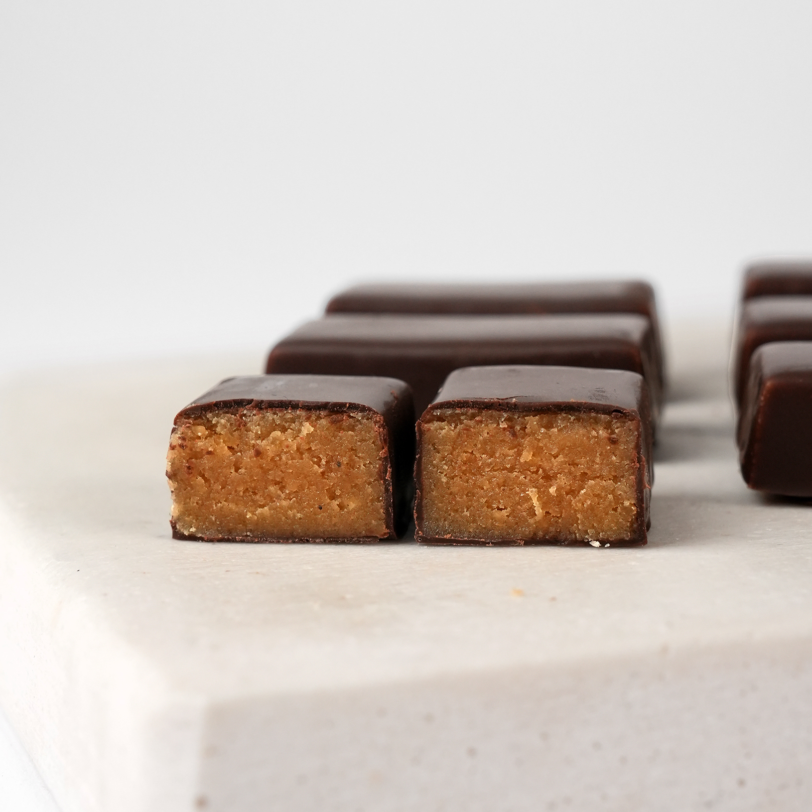 Semi-Sweet Dark chocolate marzipan with marzipan made from Mediterranean almonds, bitter almonds and hand-grated brittle.