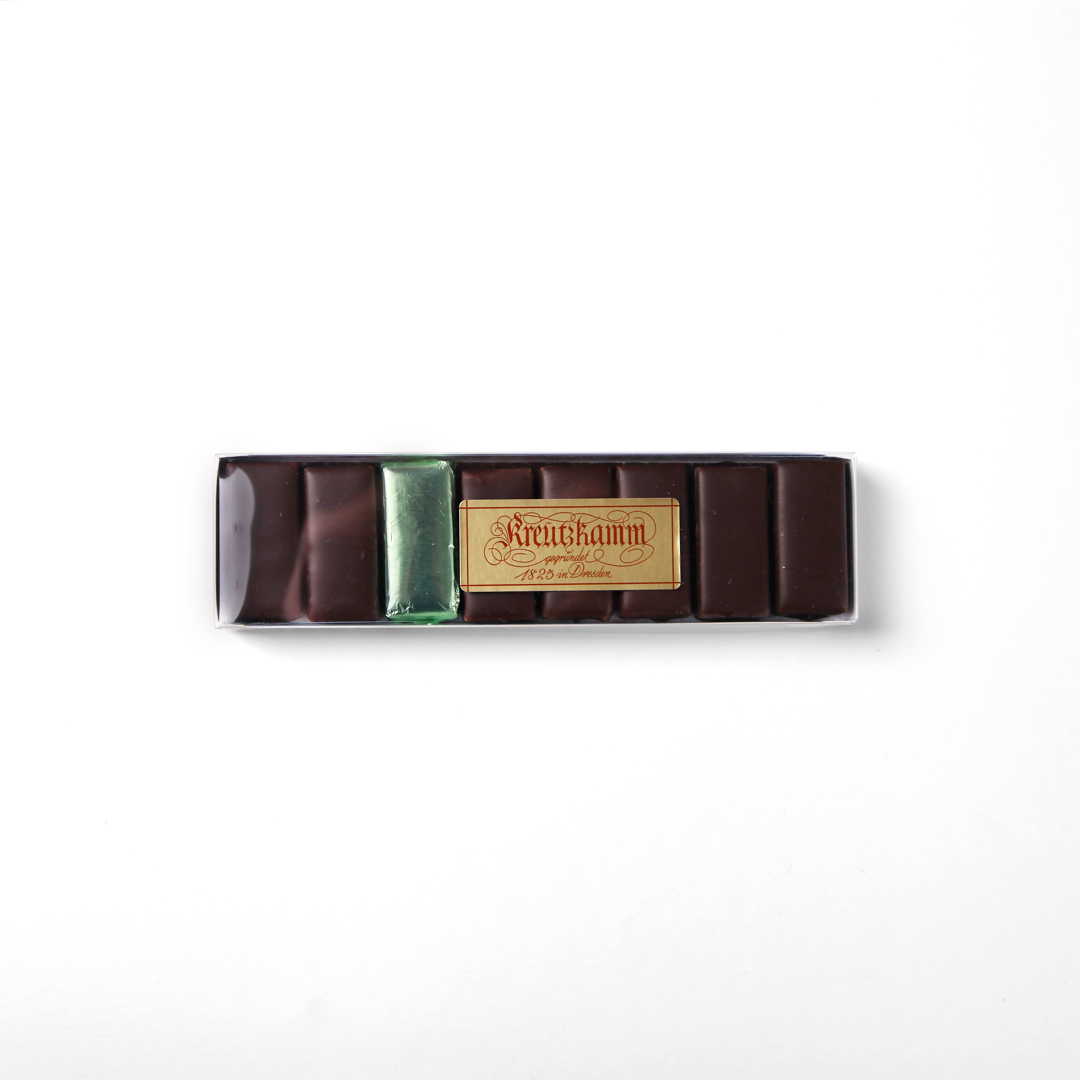 Marzipan (almonds, sugar, invert sugar syrup), chocolate couverture with at least 63 % cocoa content (cocoa mass, sugar, cocoa butter, emulsifier: soy lecithin), almonds, sugar, rum, invert sugar syrup, natural vanilla flavoring.