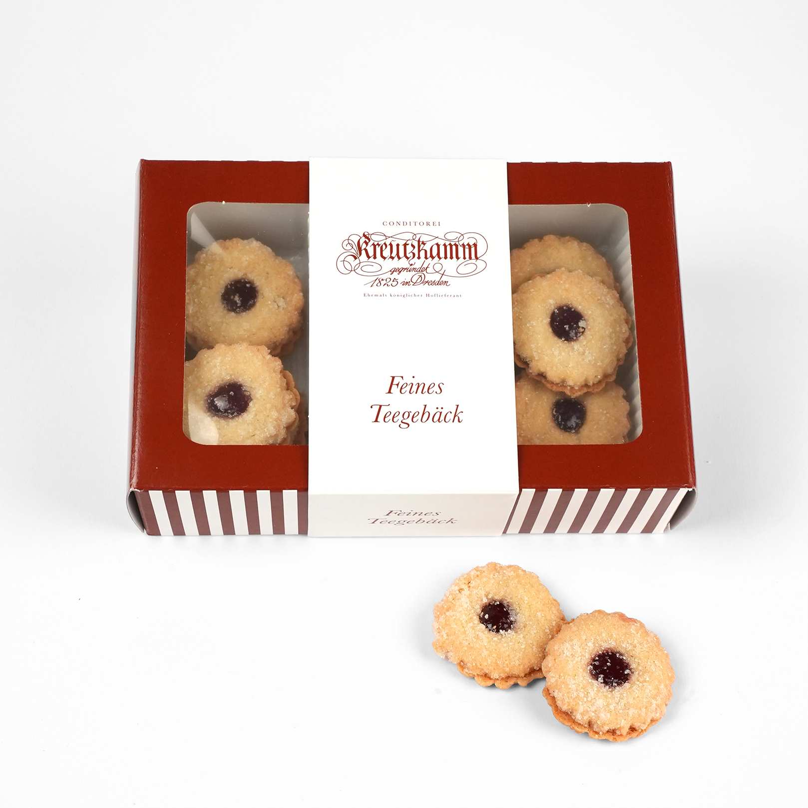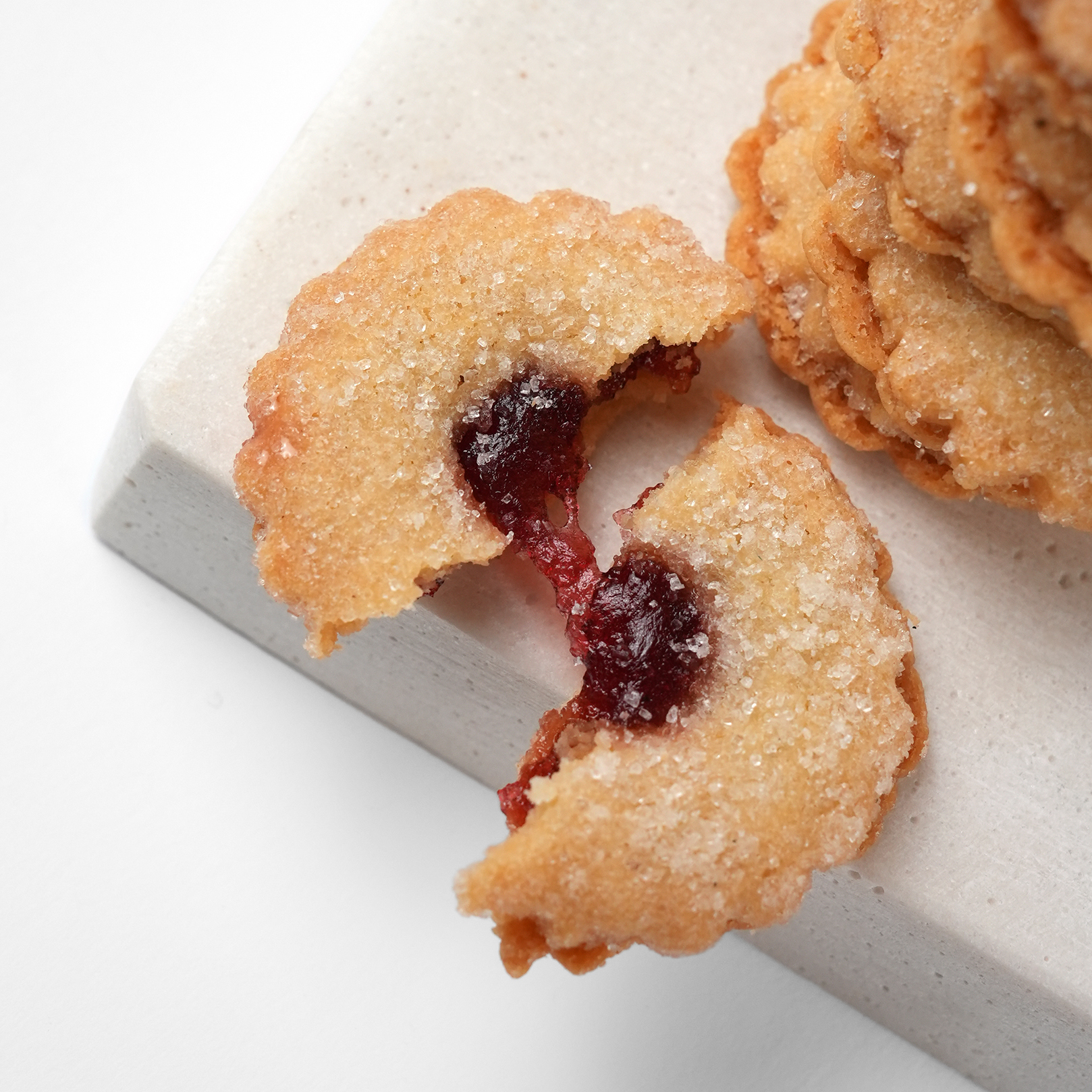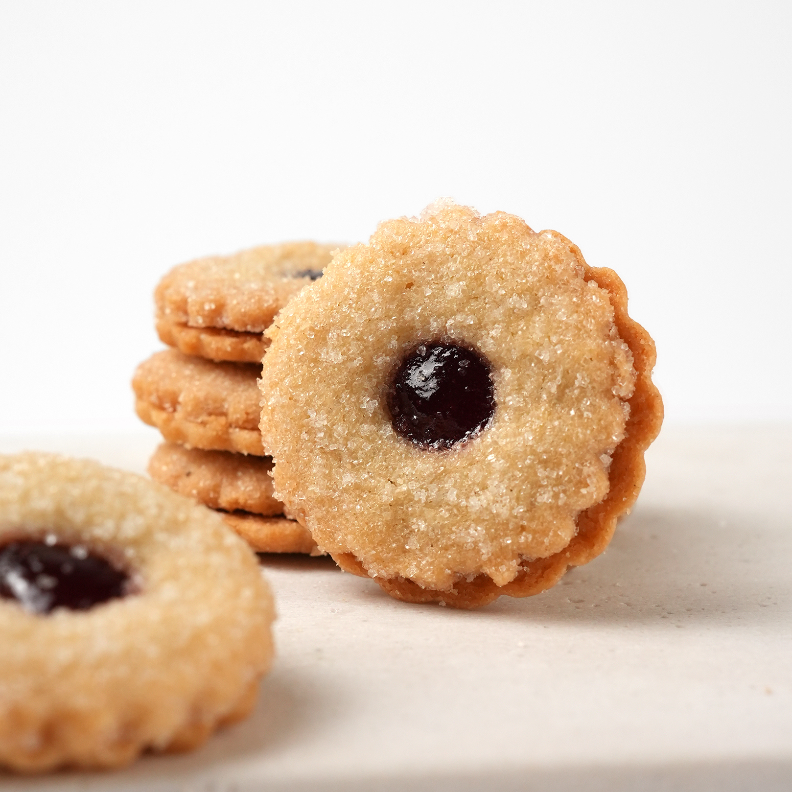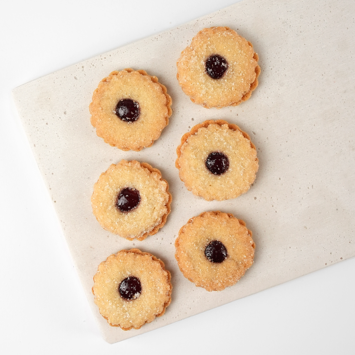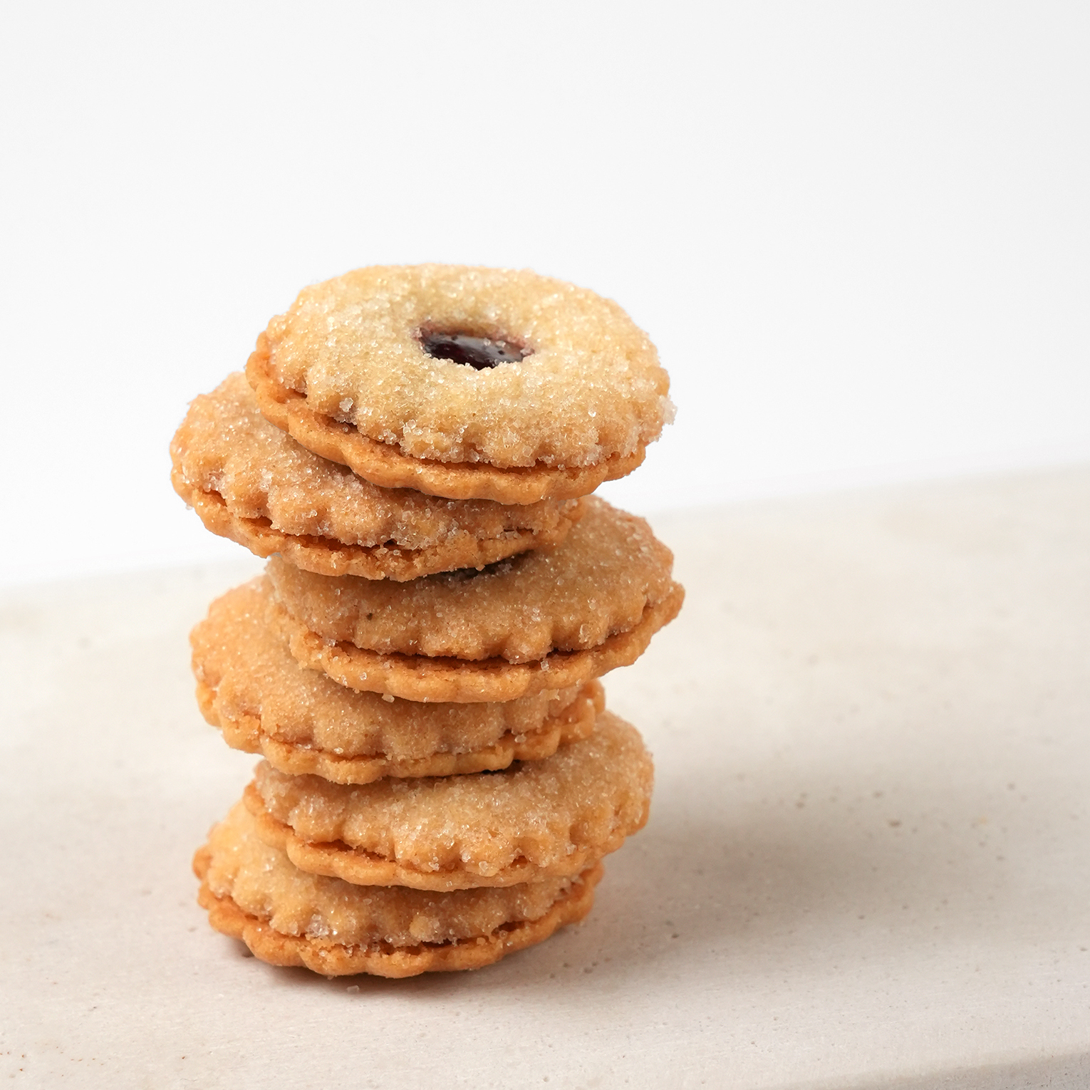 Delicate butter cookies filled with raspberry and redcurrant jam