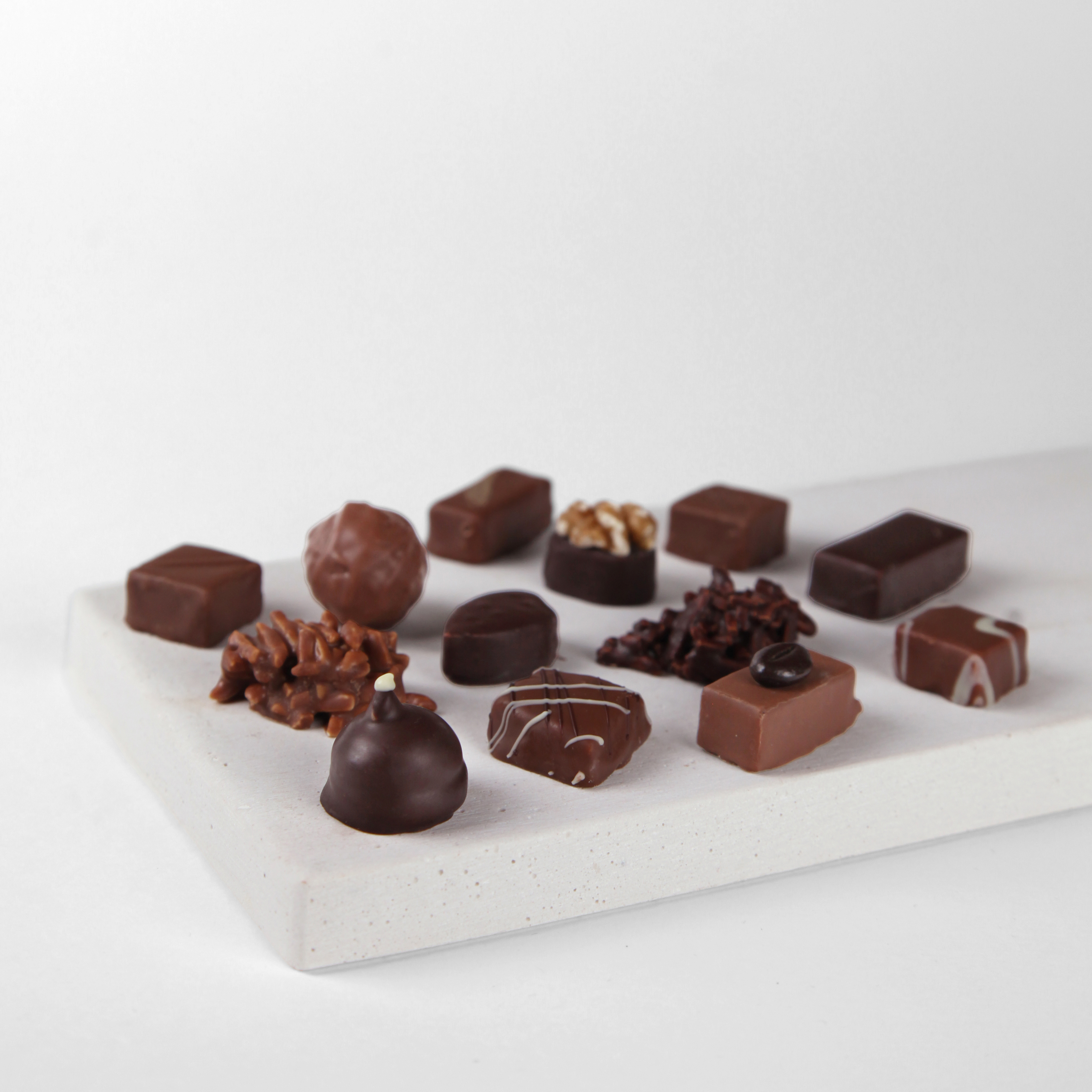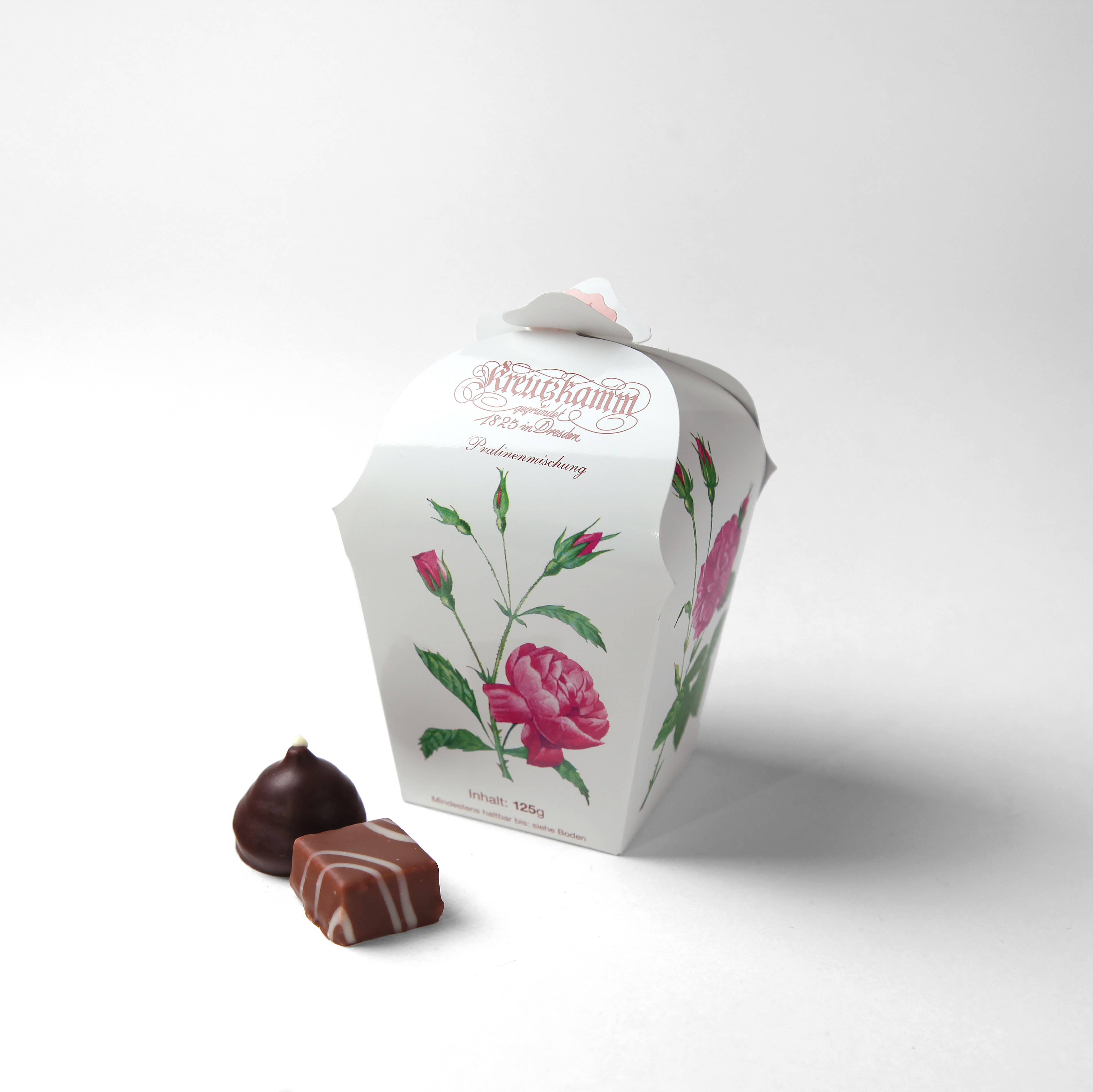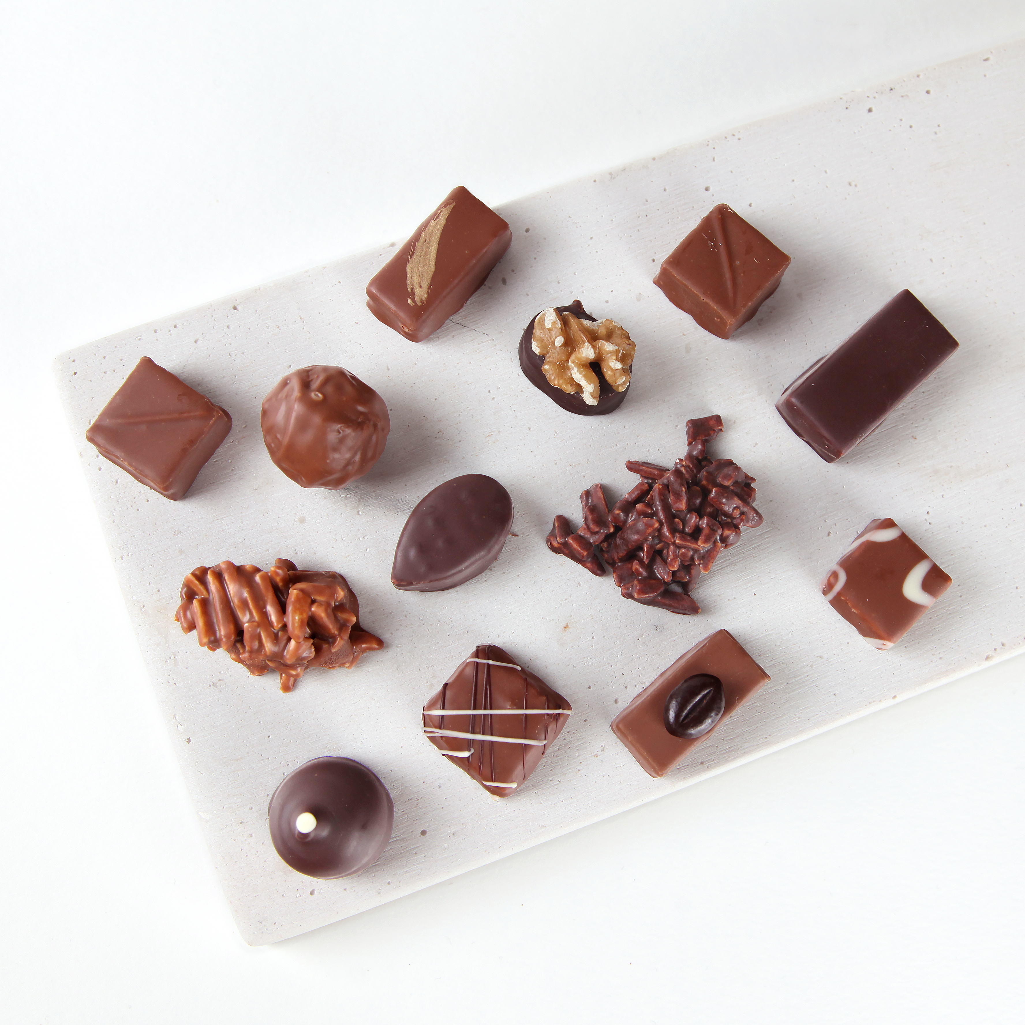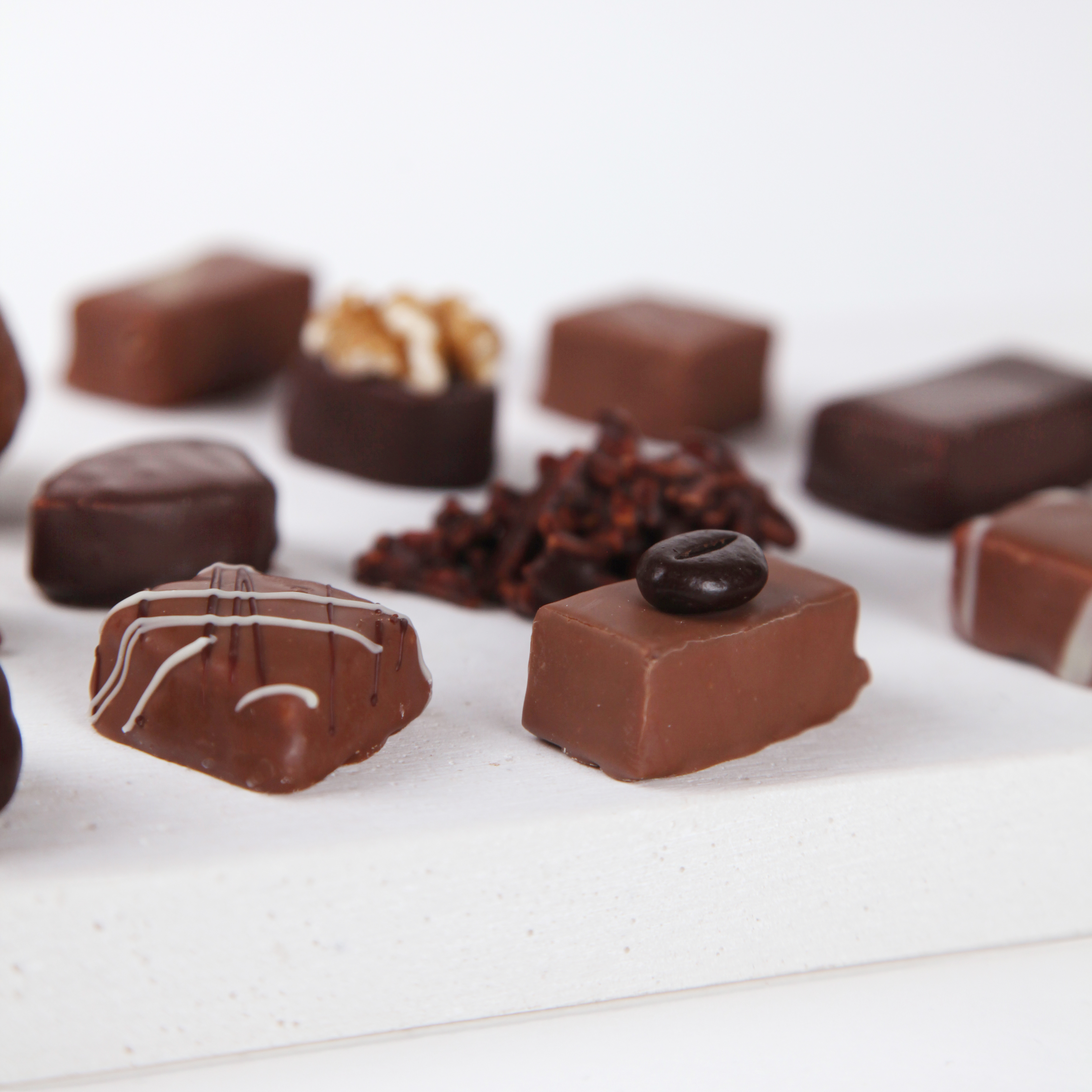 Sugar, almonds, cream (stabilizer: carrageenan, purely vegetable), butter, cocoa mass, cocoa butter, hazelnuts, glucose syrup, ginger, walnuts, invert sugar syrup, oranges, whole milk powder, spirits (brandy, rum, kirsch, arrack, fructose syrup, softener: Sorbitol syrup, ethyl alcohol, honey, natural vanilla extract, tea extract, natural flavors, acidifier: citric acid, emulsifier: soy lecithin.