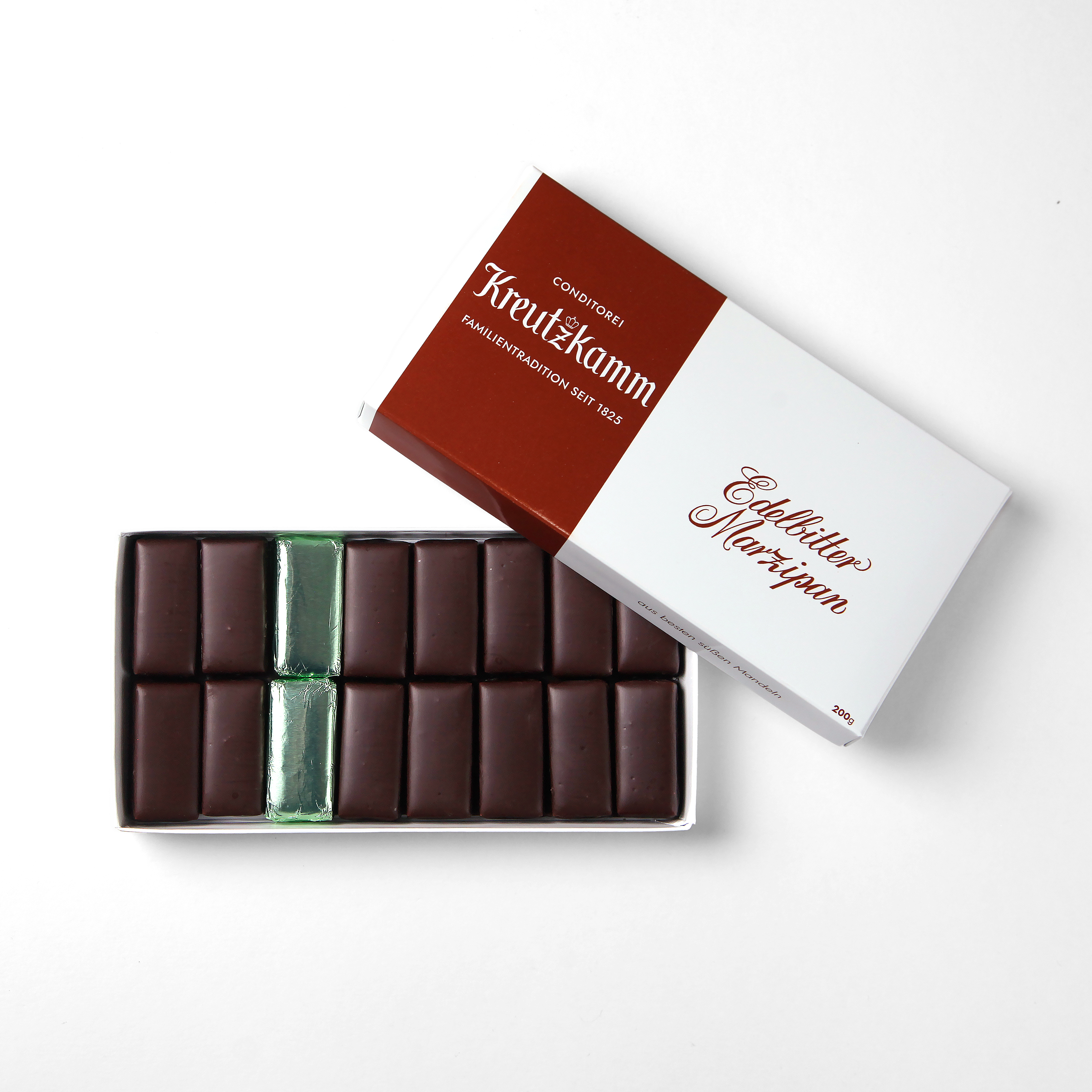Semi-Sweet Dark chocolate marzipan with marzipan made from Mediterranean almonds, bitter almonds and hand-grated brittle.