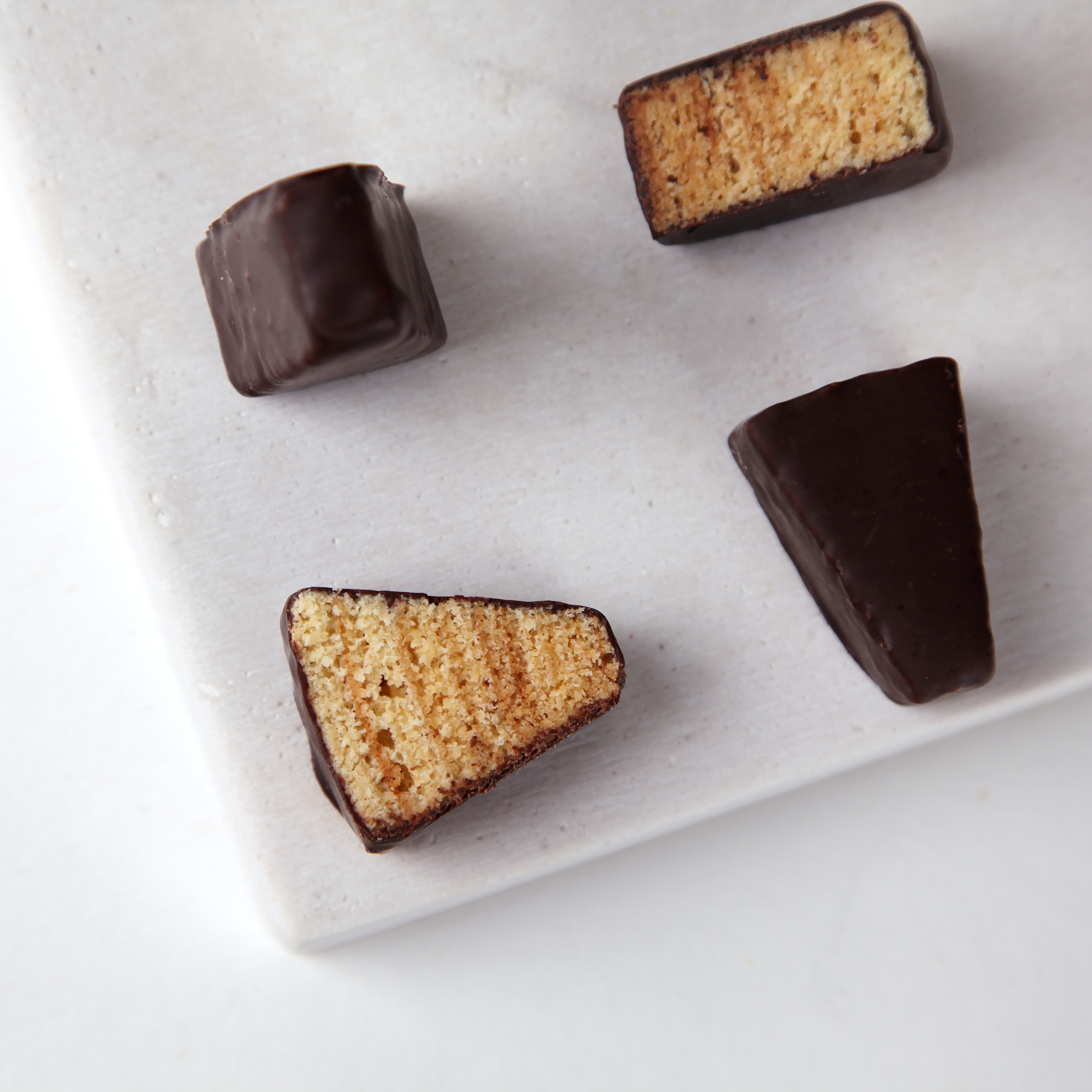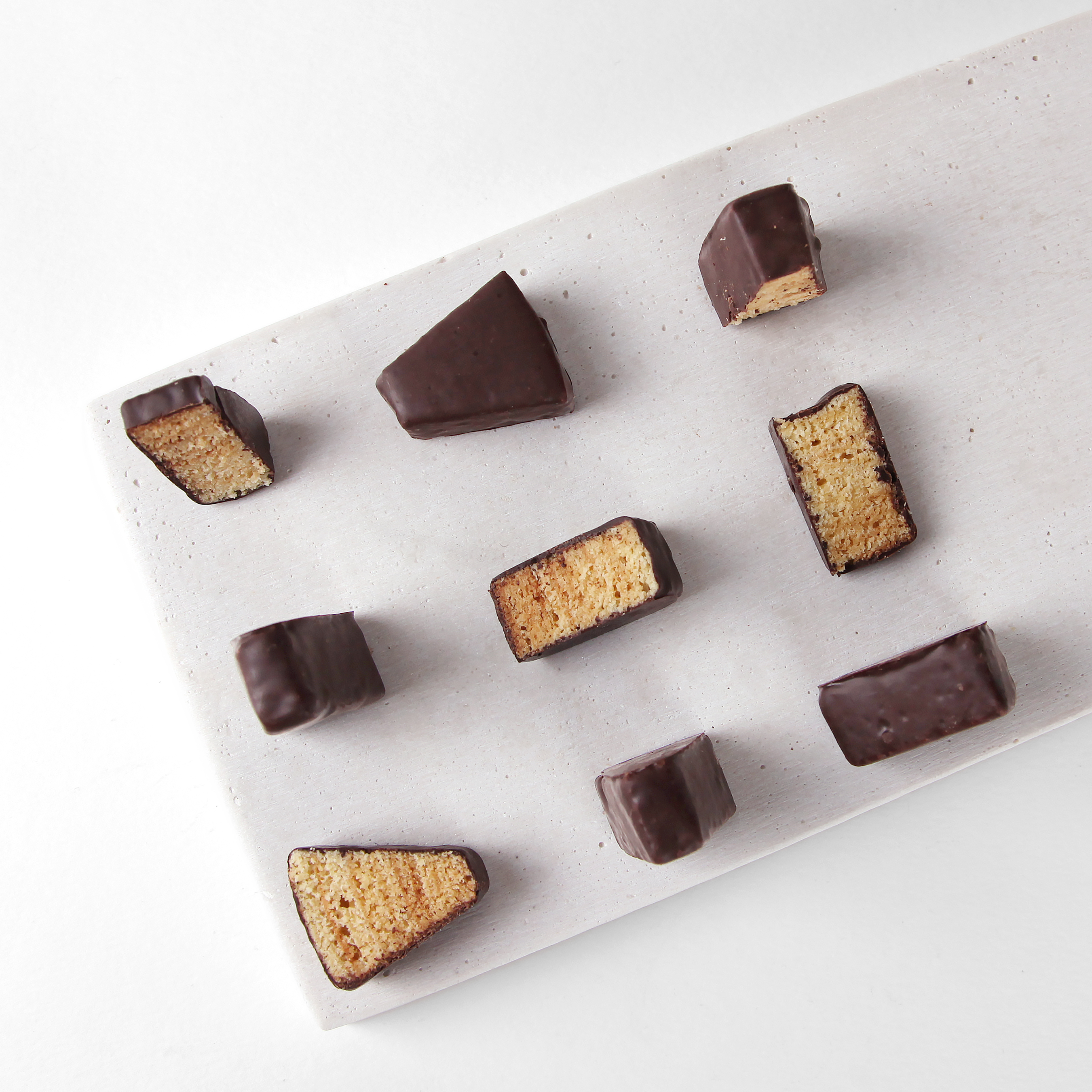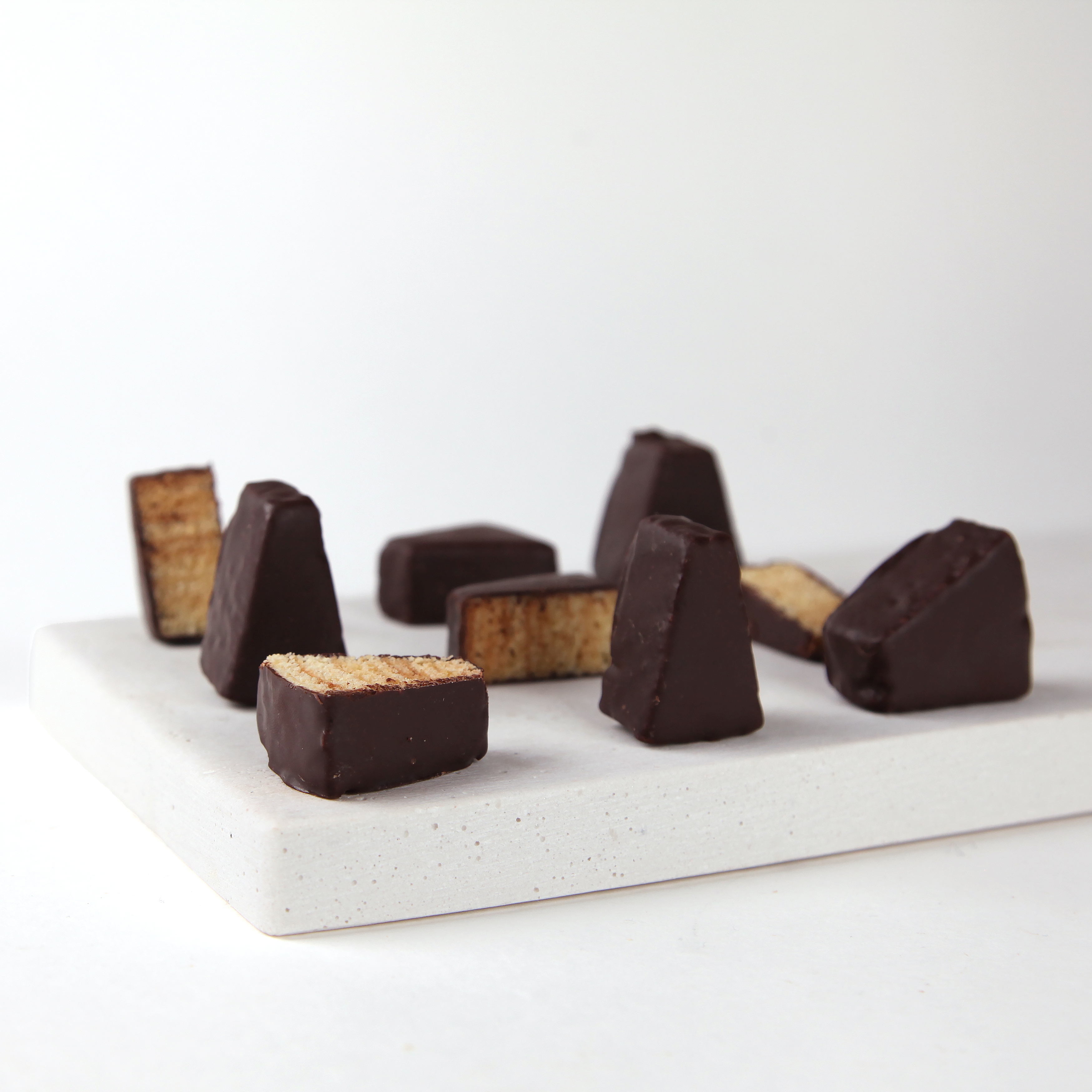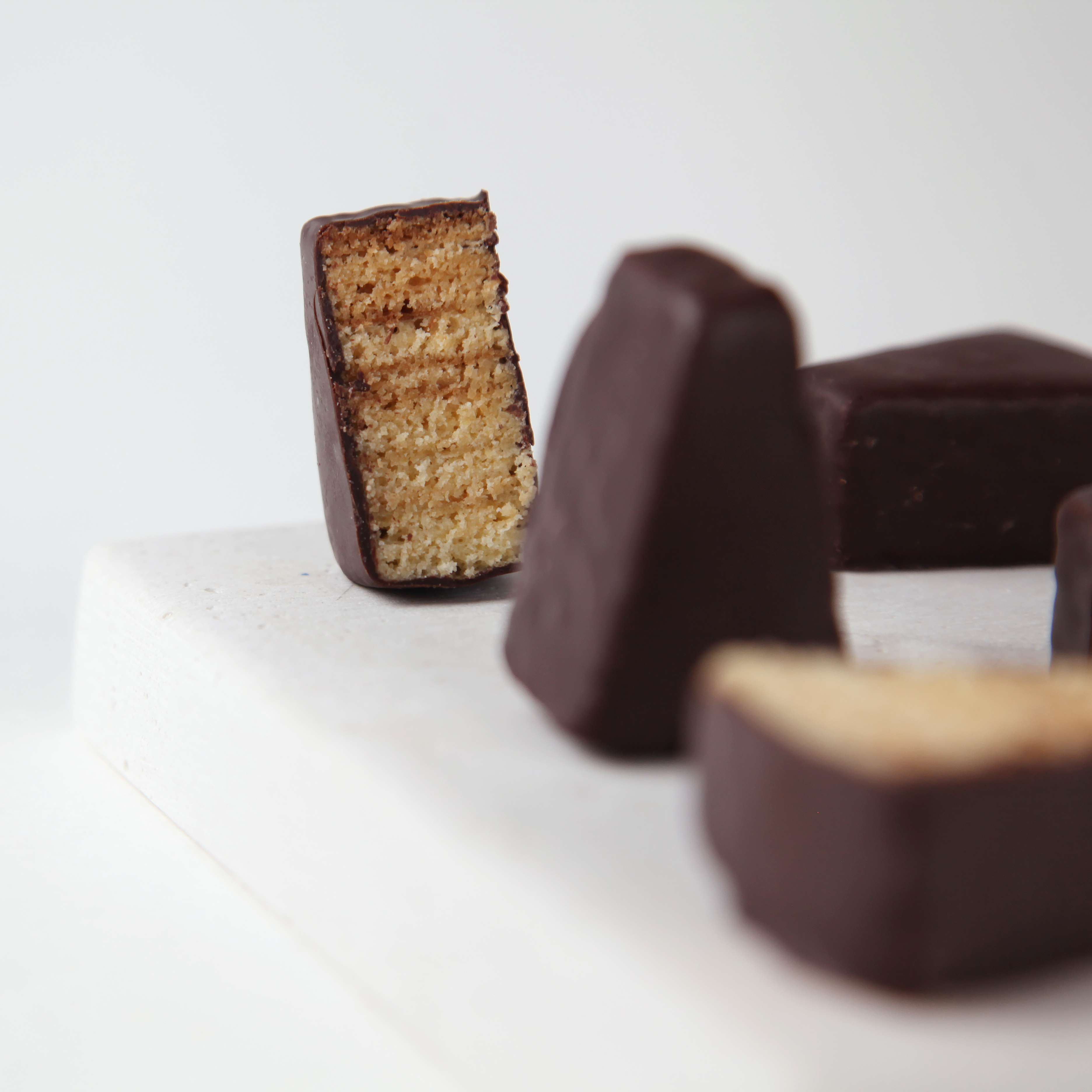 The small, bite-sized and juicy-delicate Baumkuchen bits are, like the original, baked in layers. The freshly baked Baumkuchen bits are coated with fine dark chocolate.