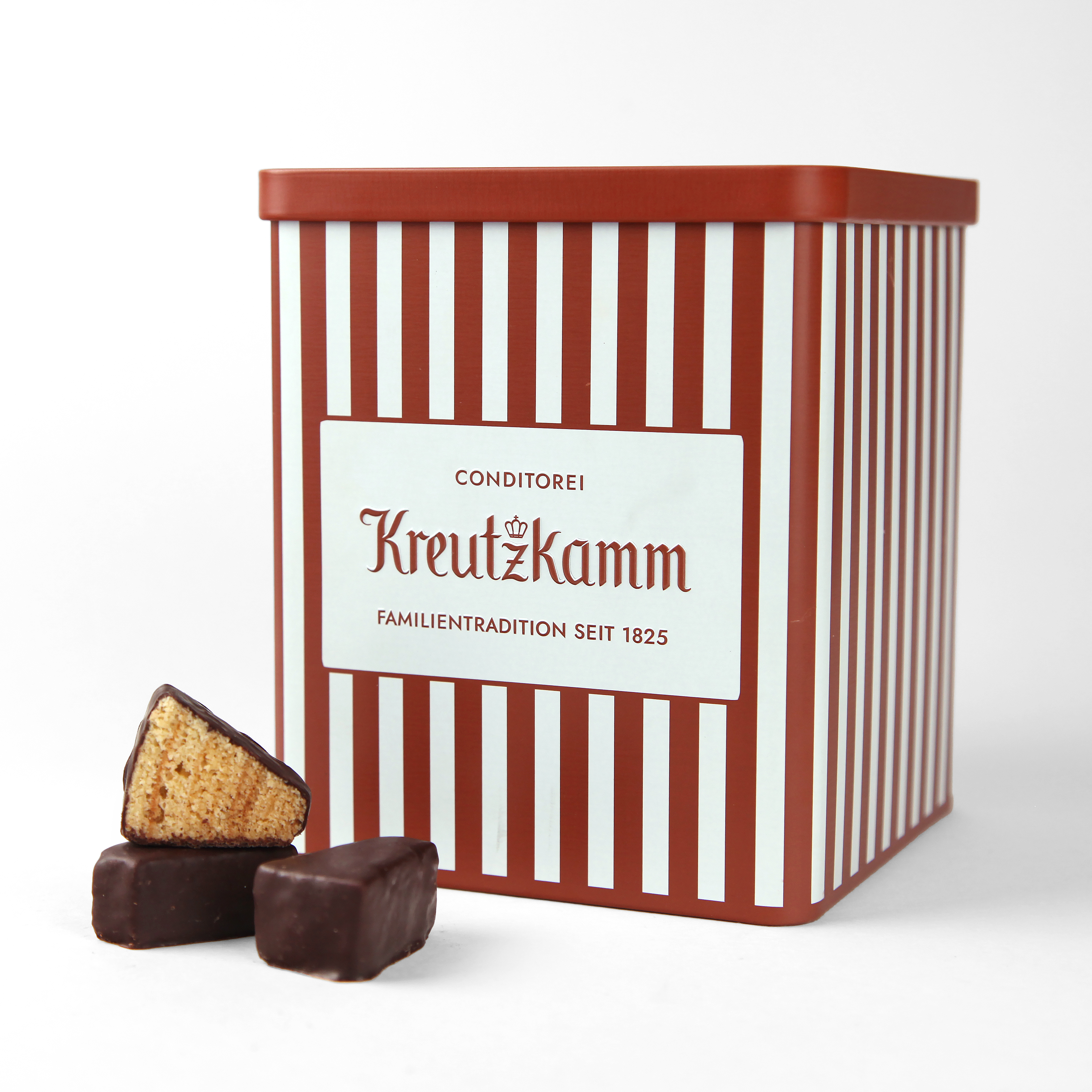 Tree Cake Bits in decorative tin, covered with dark chocolate