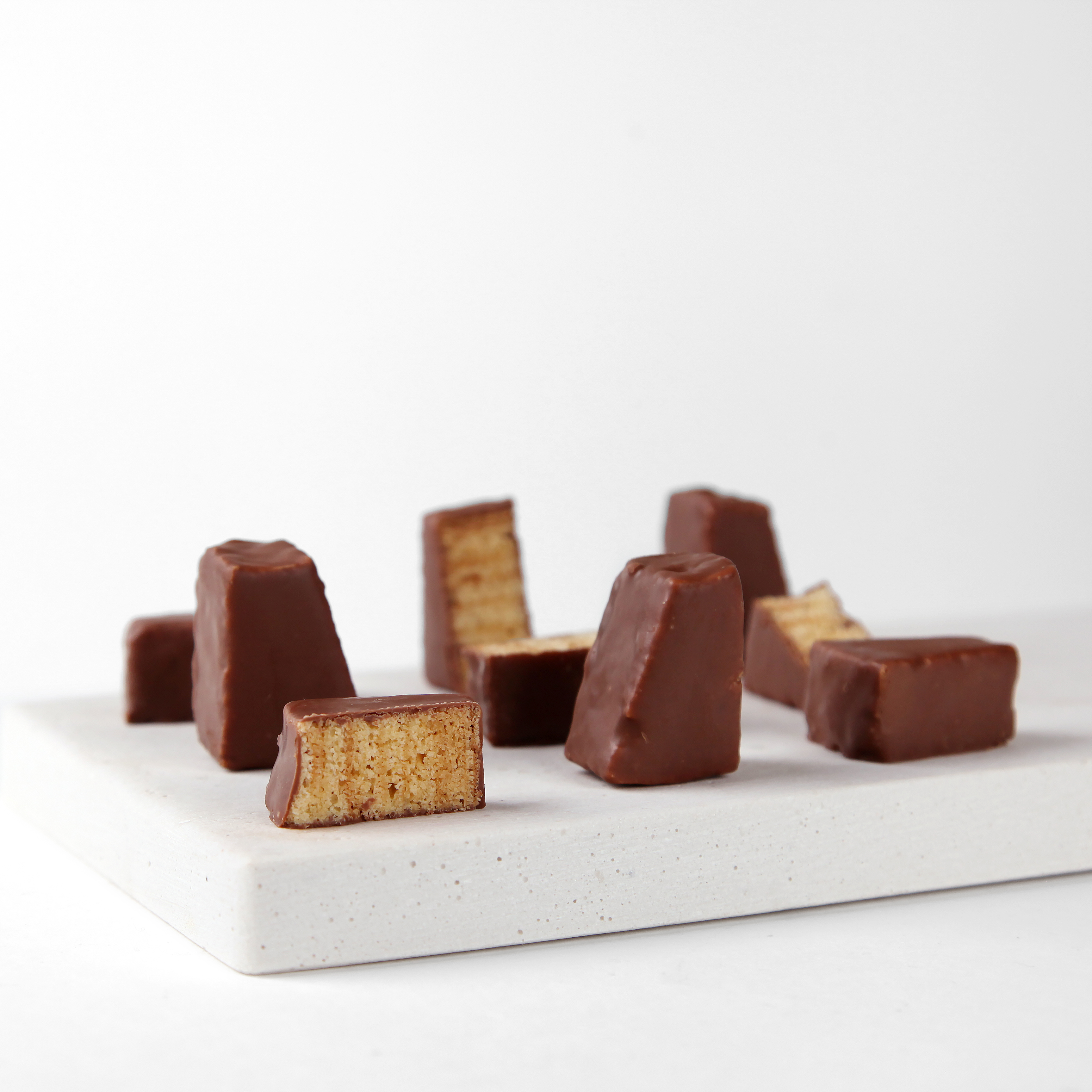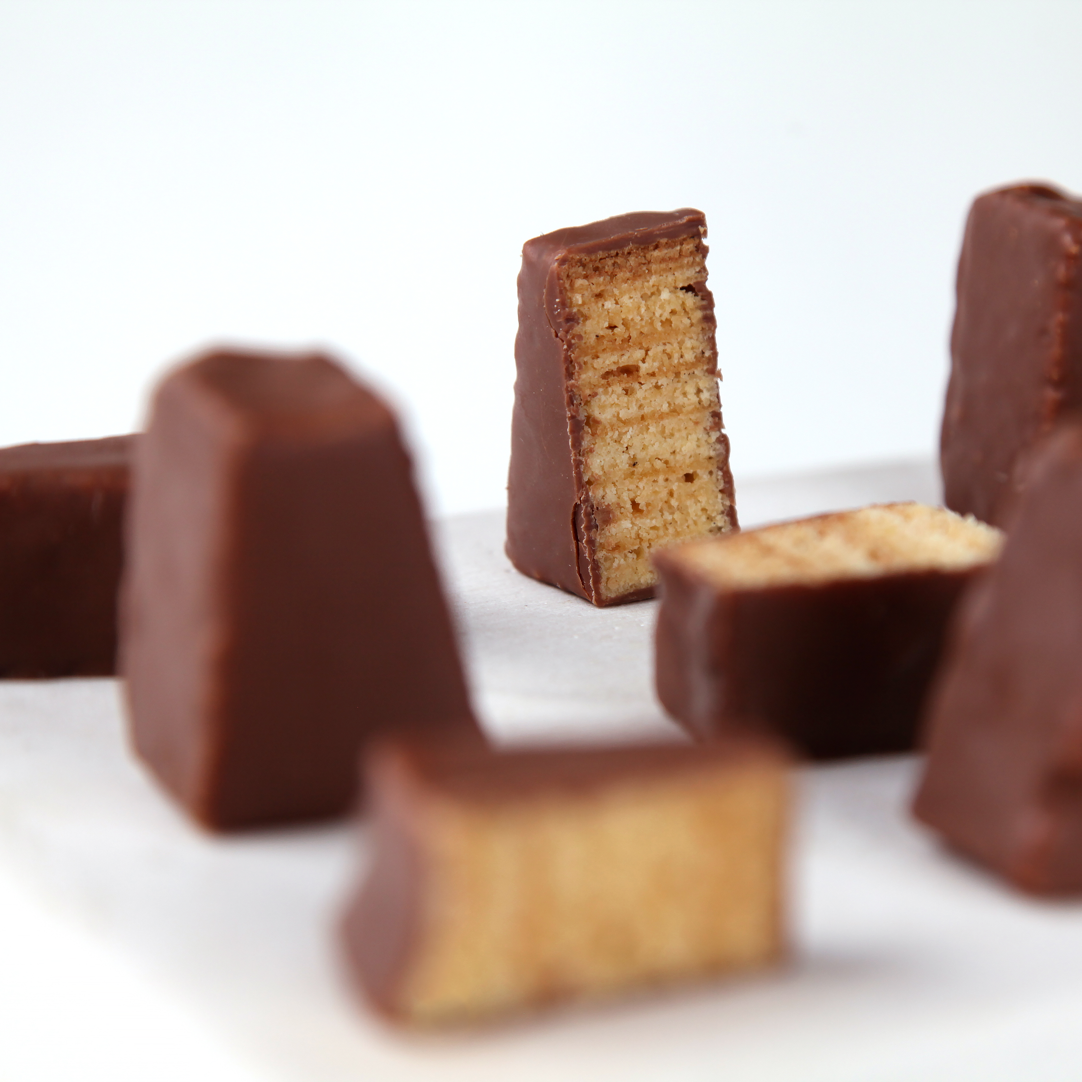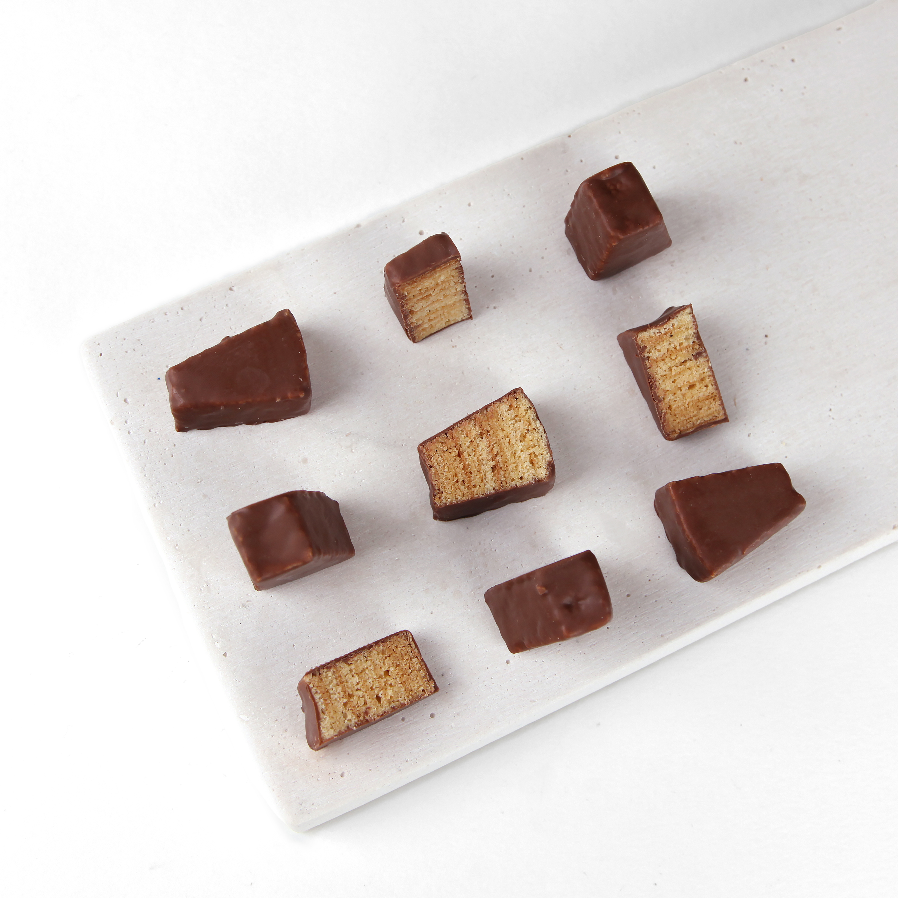 Small, bite-sized and juicy-delicate Baumkuchen bits are, like the original, baked in layers. The freshly baked Baumkuchen bits are coated with fine wholemilk chocolate.