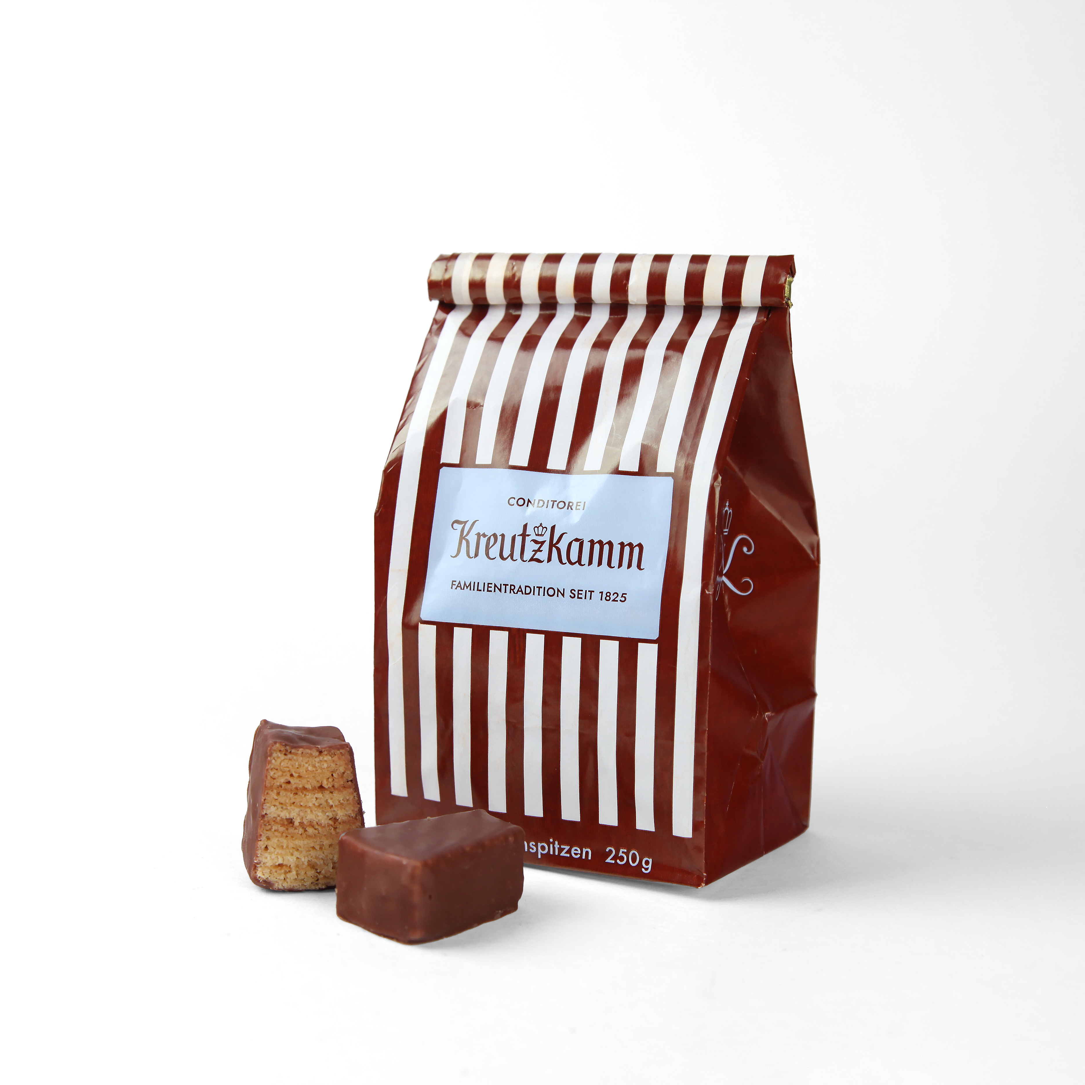 Baumkuchenspitzen in a sachet, covered with wholemilk chocolate