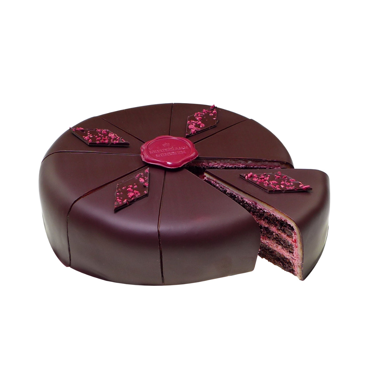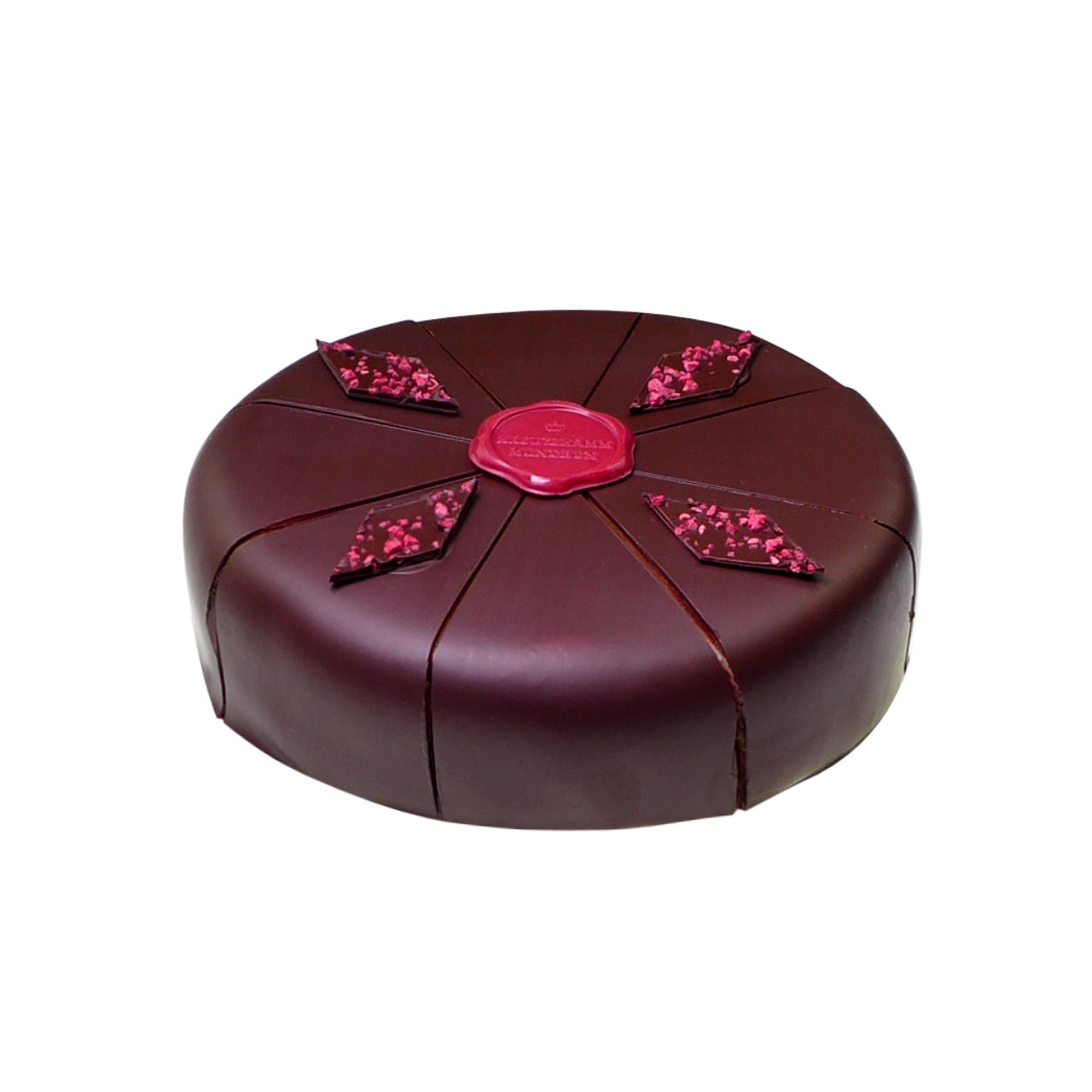 Between the vegan chocolate layers, the cake is filled with a vegan raspberry cream, covered with marzipan and vegan chocolate couverture. Even our raspberry colored Conditorei Kreutzkamm seal is of course vegan.