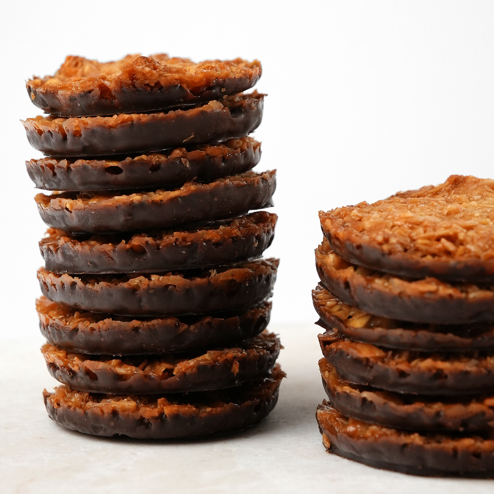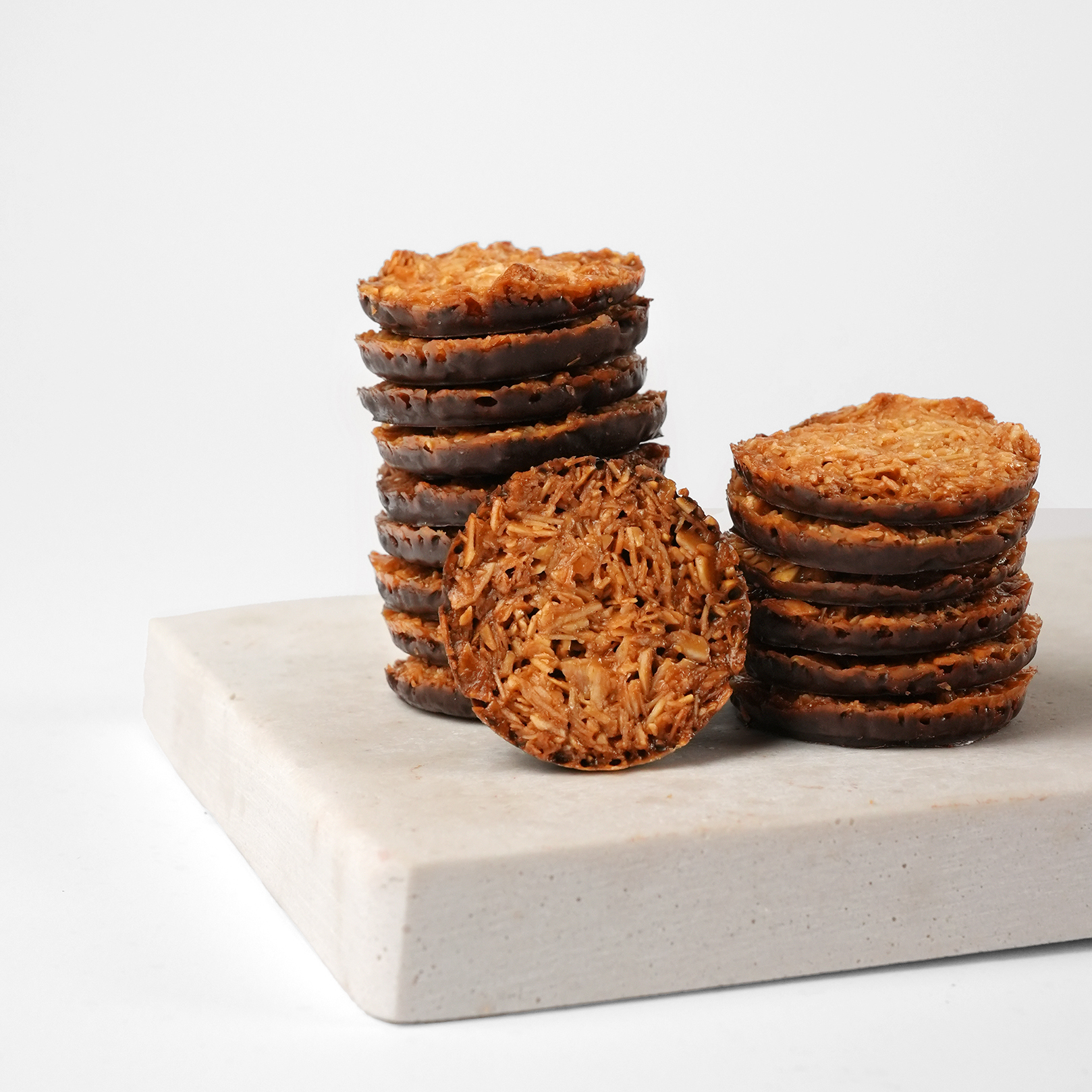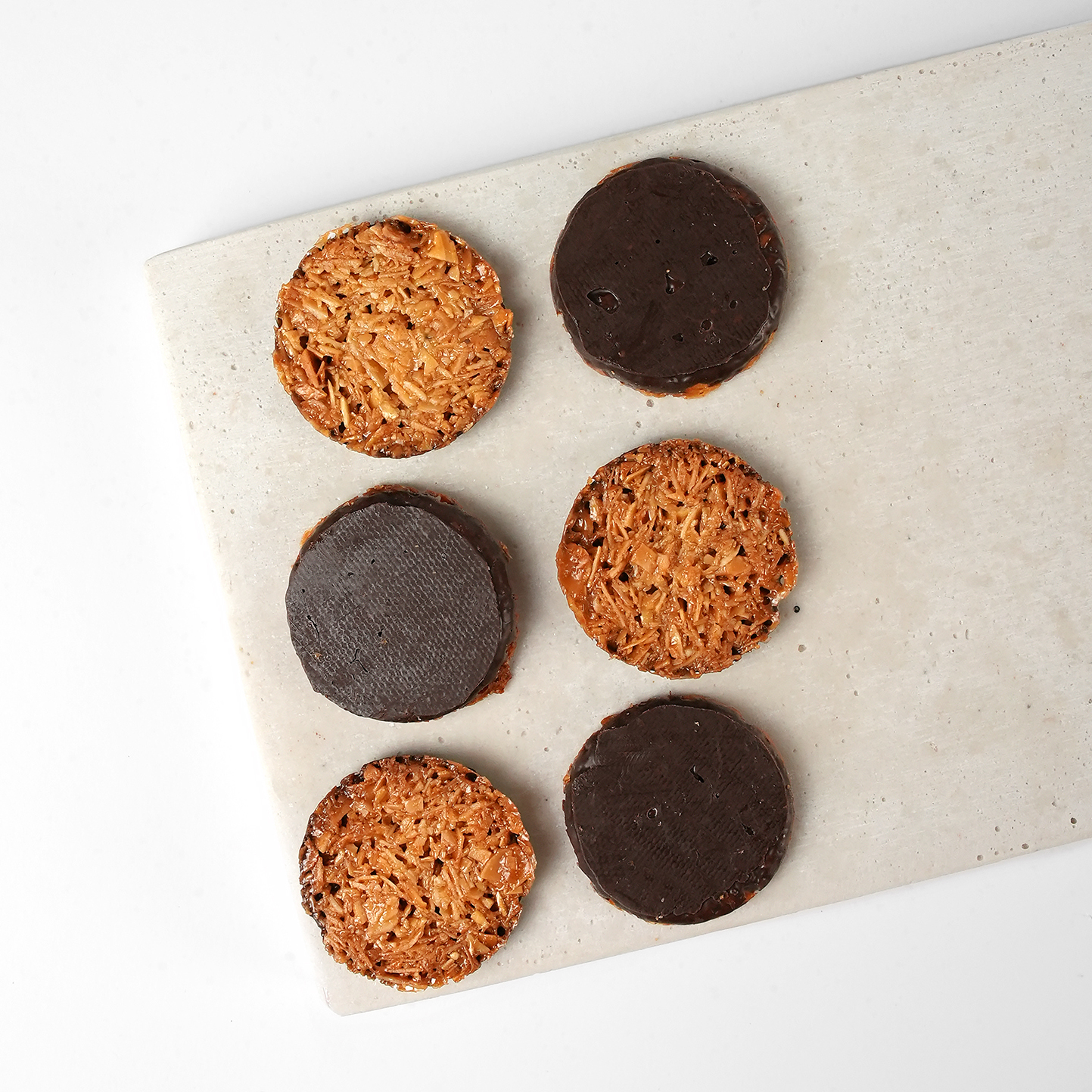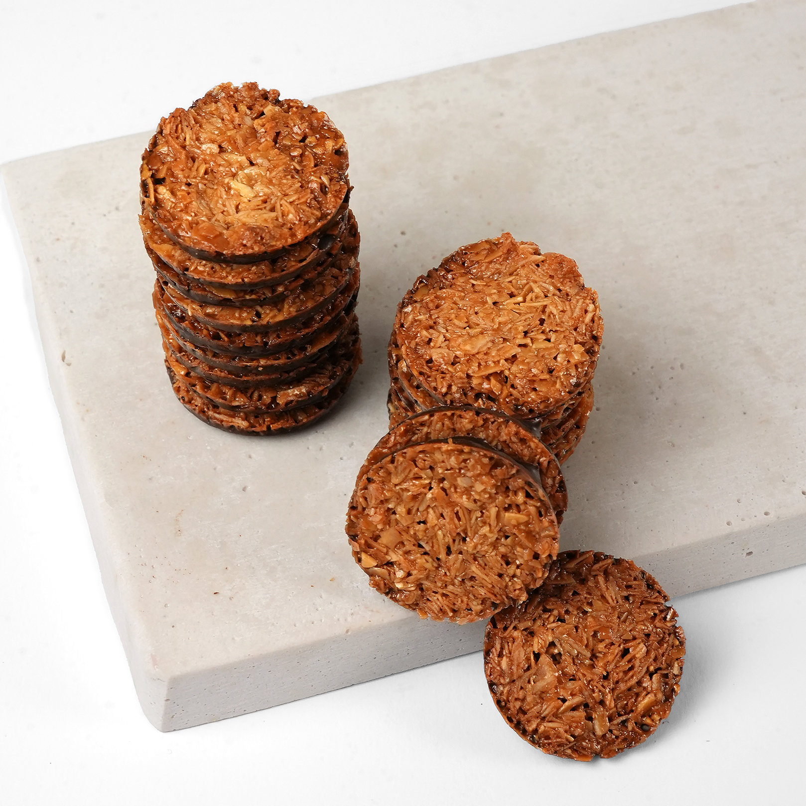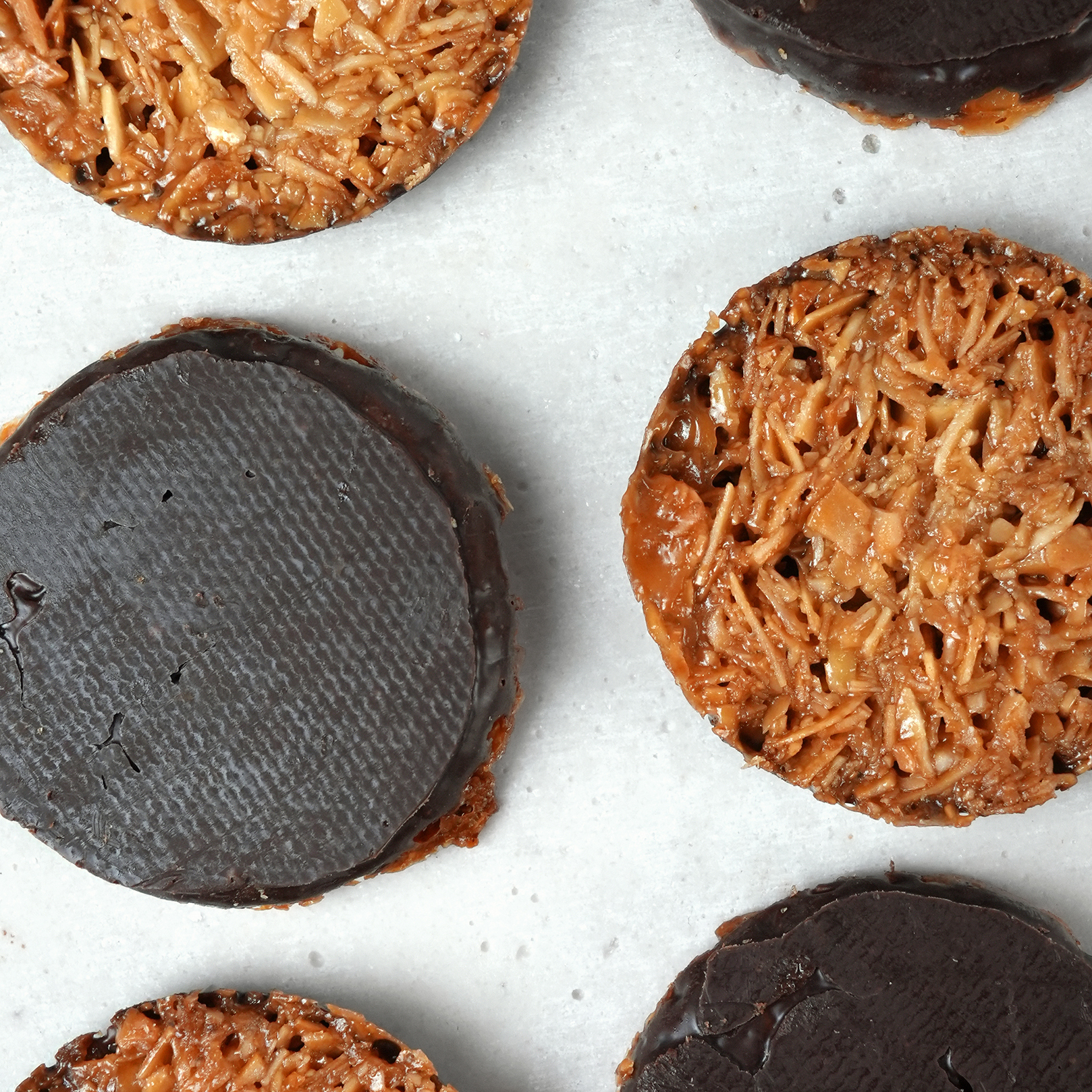 Jeder Florentiner wird von Hand geformt und mit größter Präzision gebacken, bis das perfekte Gleichgewicht aus Karamell und Knusper erreicht ist. Die Unterseite wird mit feinster Kuvertüre veredelt – für einen vollendeten Genuss.