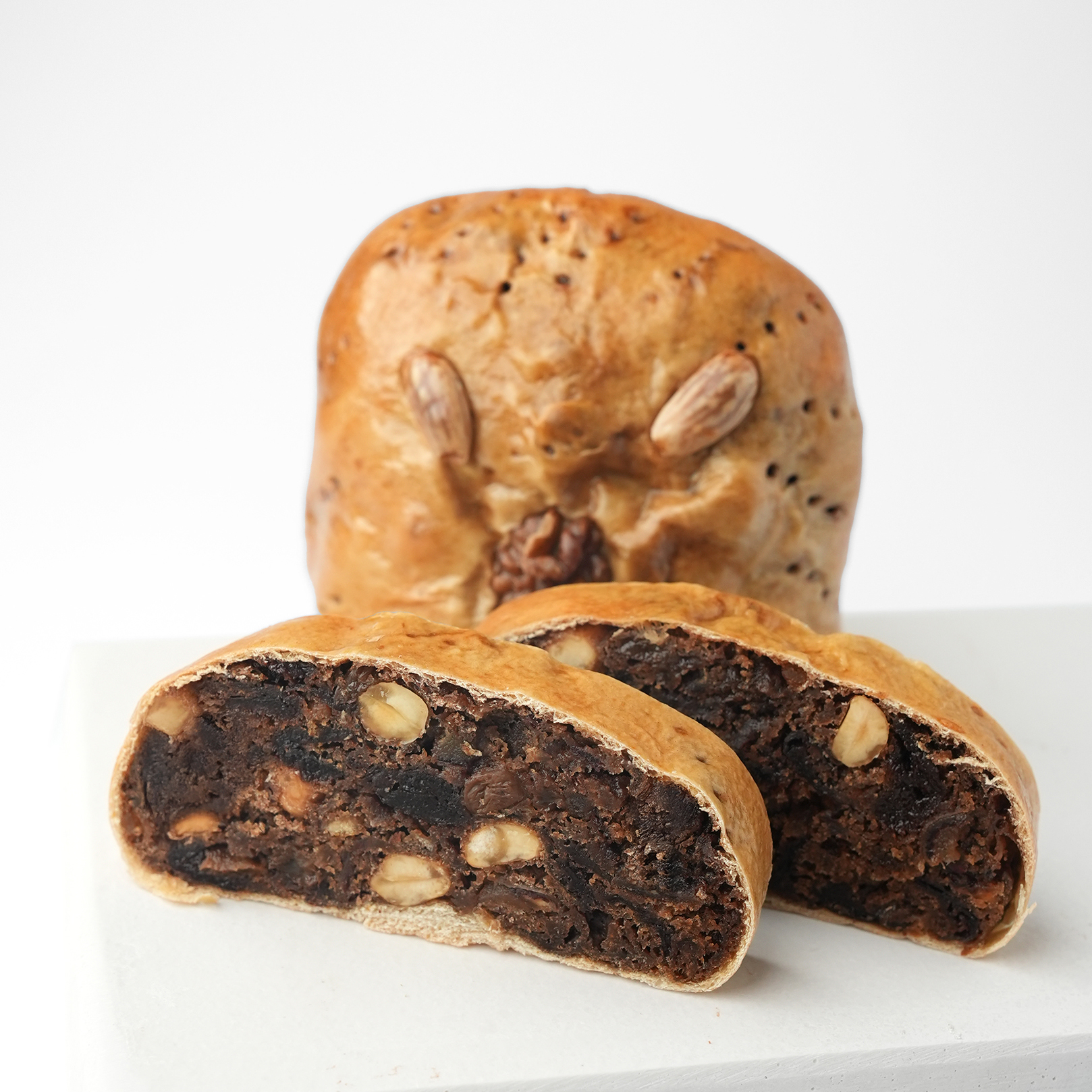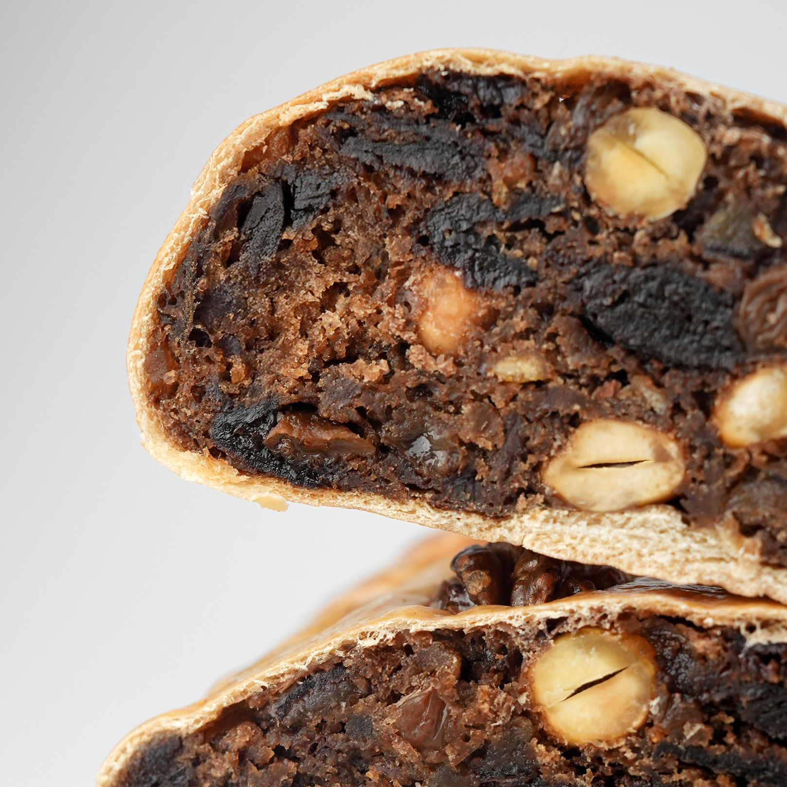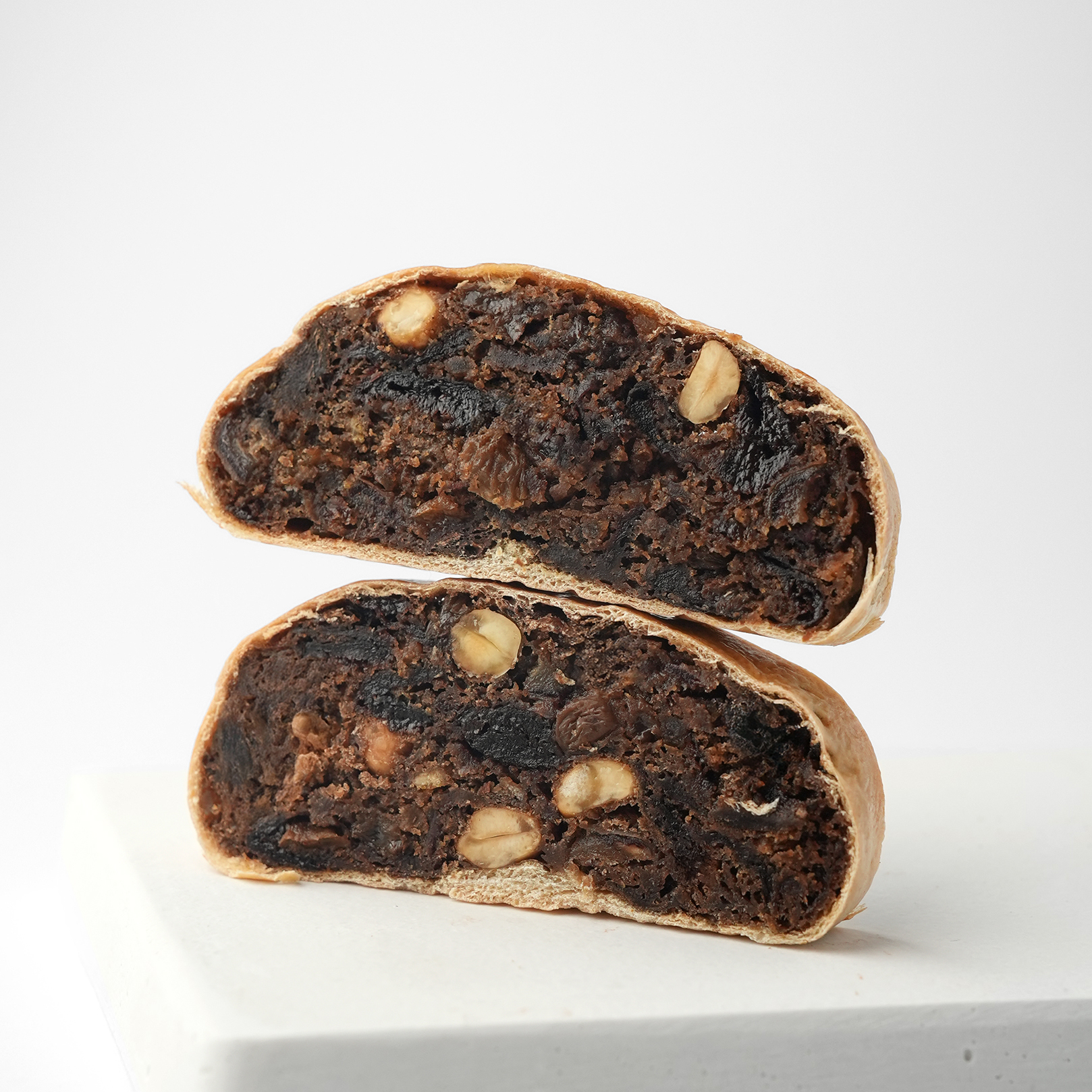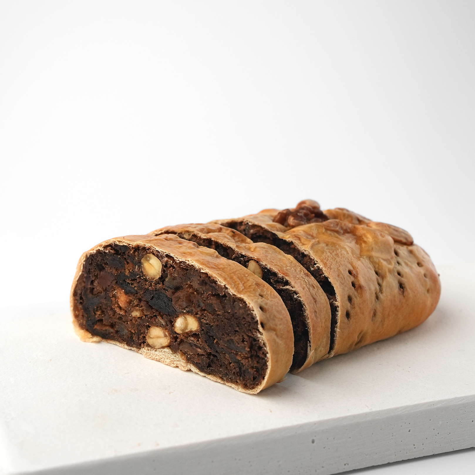 Unser Früchtebrot ist gefüllt mit u.a. verschiedenen gehackten Nüssen, Feigen, Datteln,