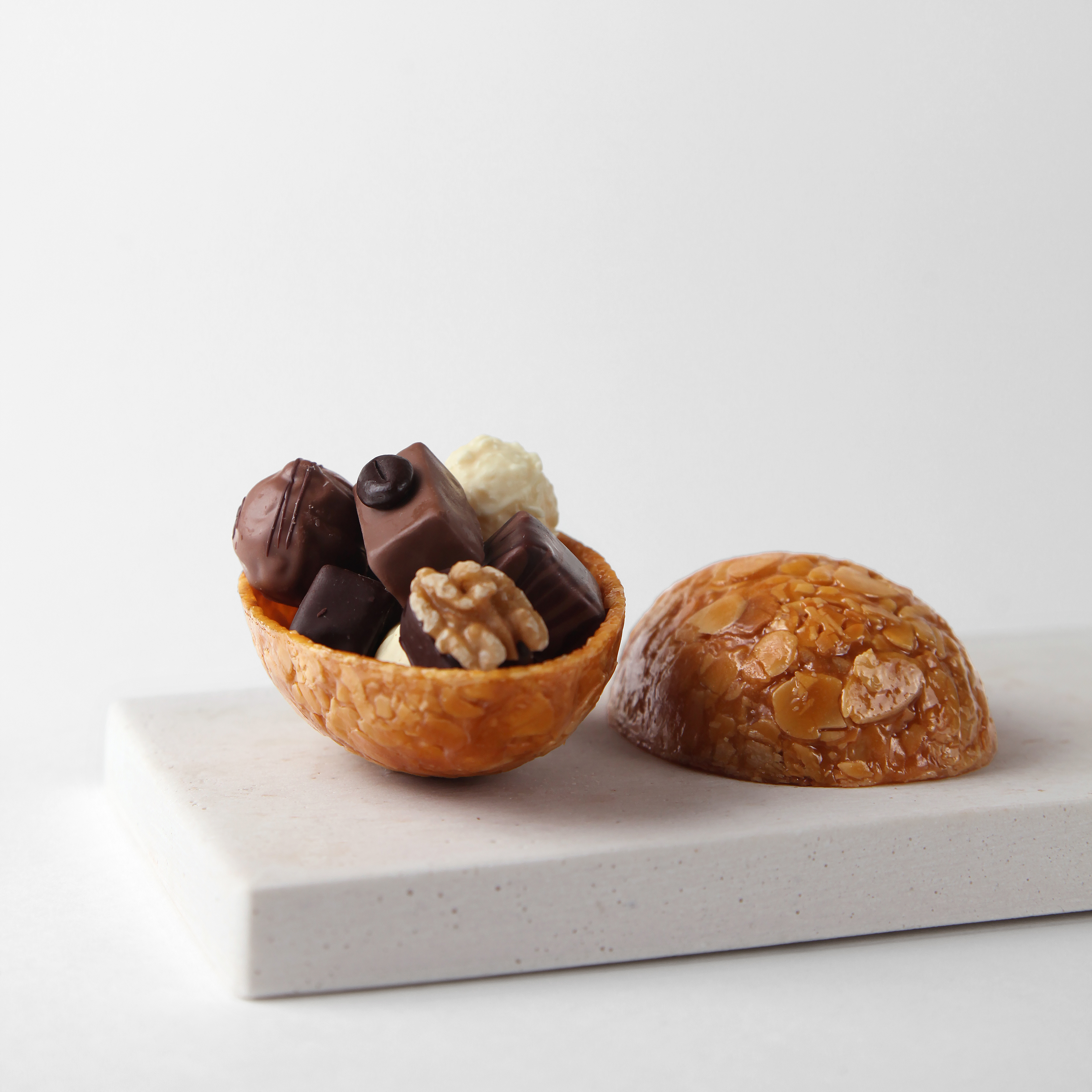 Der Krokant wird in unserer Confiserie im Kupferkessel frisch karamellisiert, sorgfältig ausgerollt und in liebevoller Handarbeit in Form gepresst. Nach dem Auskühlen wird das Ei mit erlesenen Pralinen gefüllt – für ein außergewöhnliches Geschmackserlebnis mit feiner Crunchnote.
