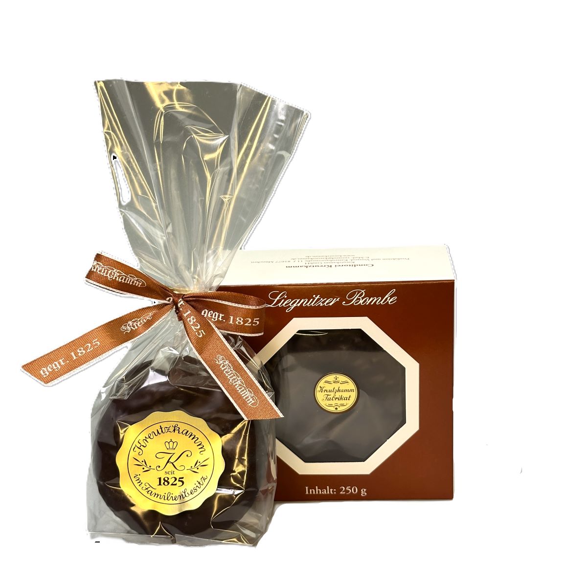Die Liegnitzer Bombe ist eine echte Rarität aus Niederschlesien: ein kleiner, runder Kuchen aus saftigem, braunem Honigkuchenteig, veredelt mit einer fruchtigen Füllung aus Konfitüren, Marzipan und kandierten Früchten. Umhüllt von feinherber Edelkuvertüre, begeistert sie durch ihr intensives Aroma und den unverwechselbaren Geschmack – ideal zum Genießen und Verschenken!