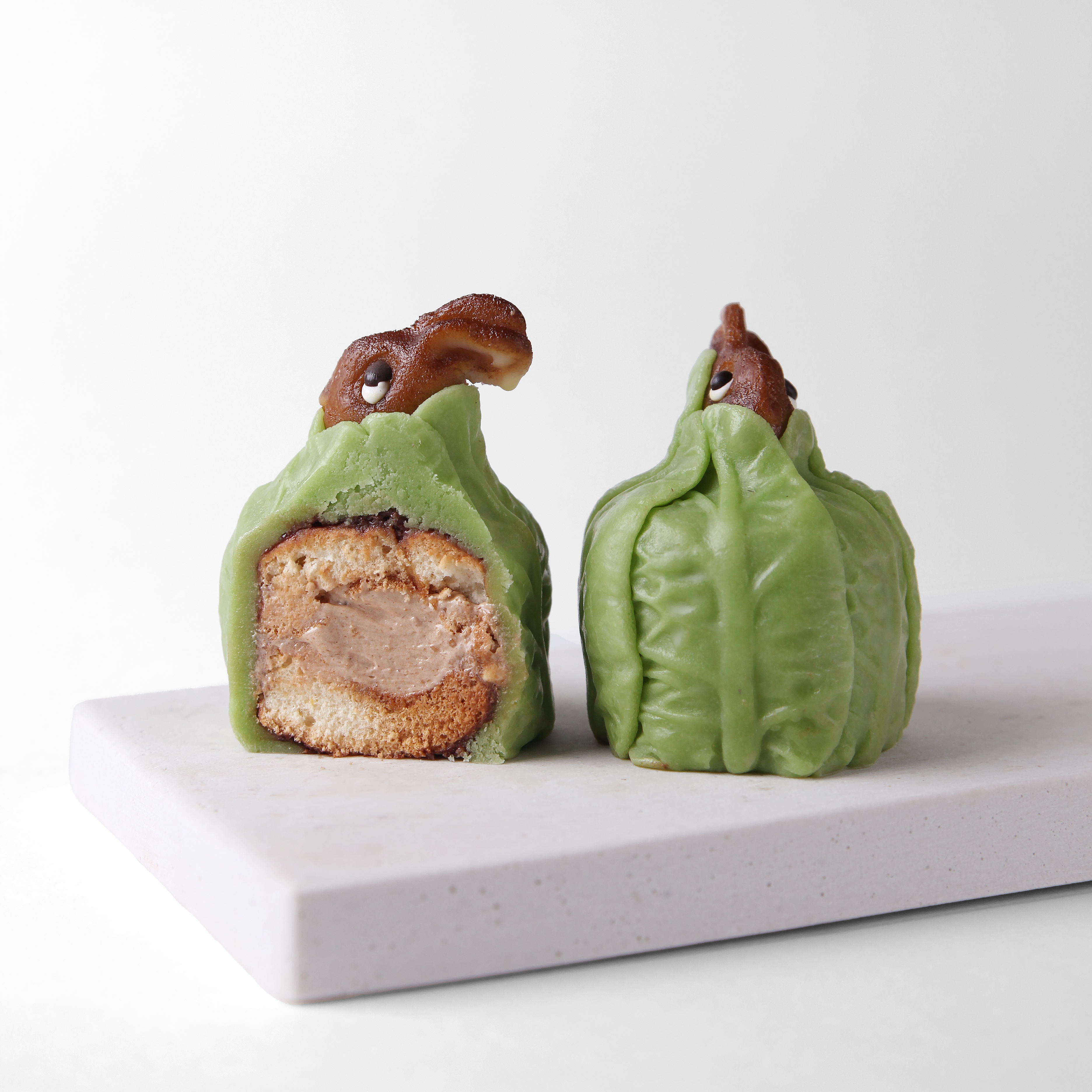 Was macht der Osterhase da im Kohl? Unser Klassiker, ein mit Nuss-Nougat-Creme gefüllter Biskuitkern, umhüllt von Marzipan-Kohlblättern und einem süßen Hasenkopf aus Marzipan, lädt auf alle Fälle zum Schmunzeln ein.