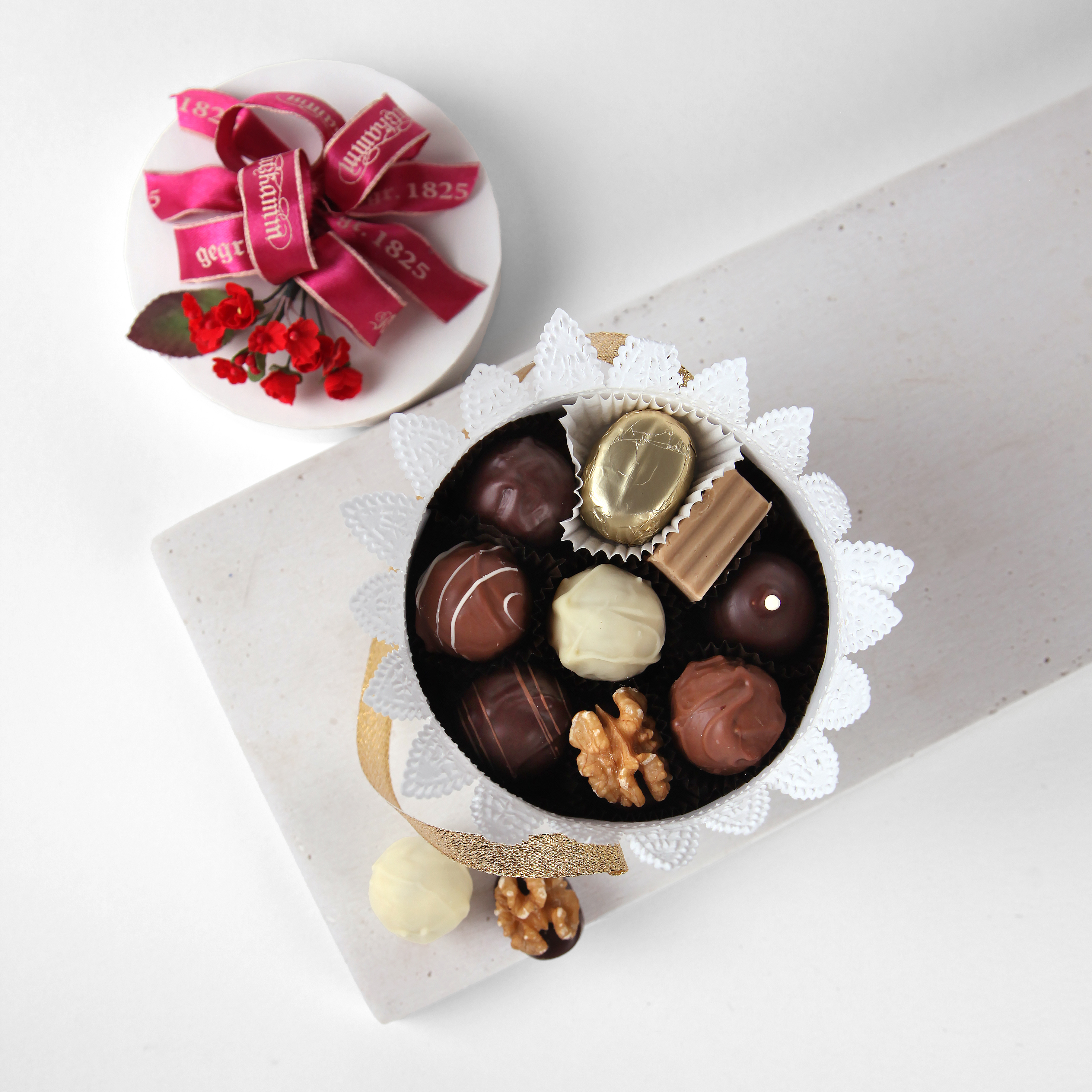 Feinste handgefertigte Pralinen, stilvoll verpackt in einem eleganten Hutkoffer