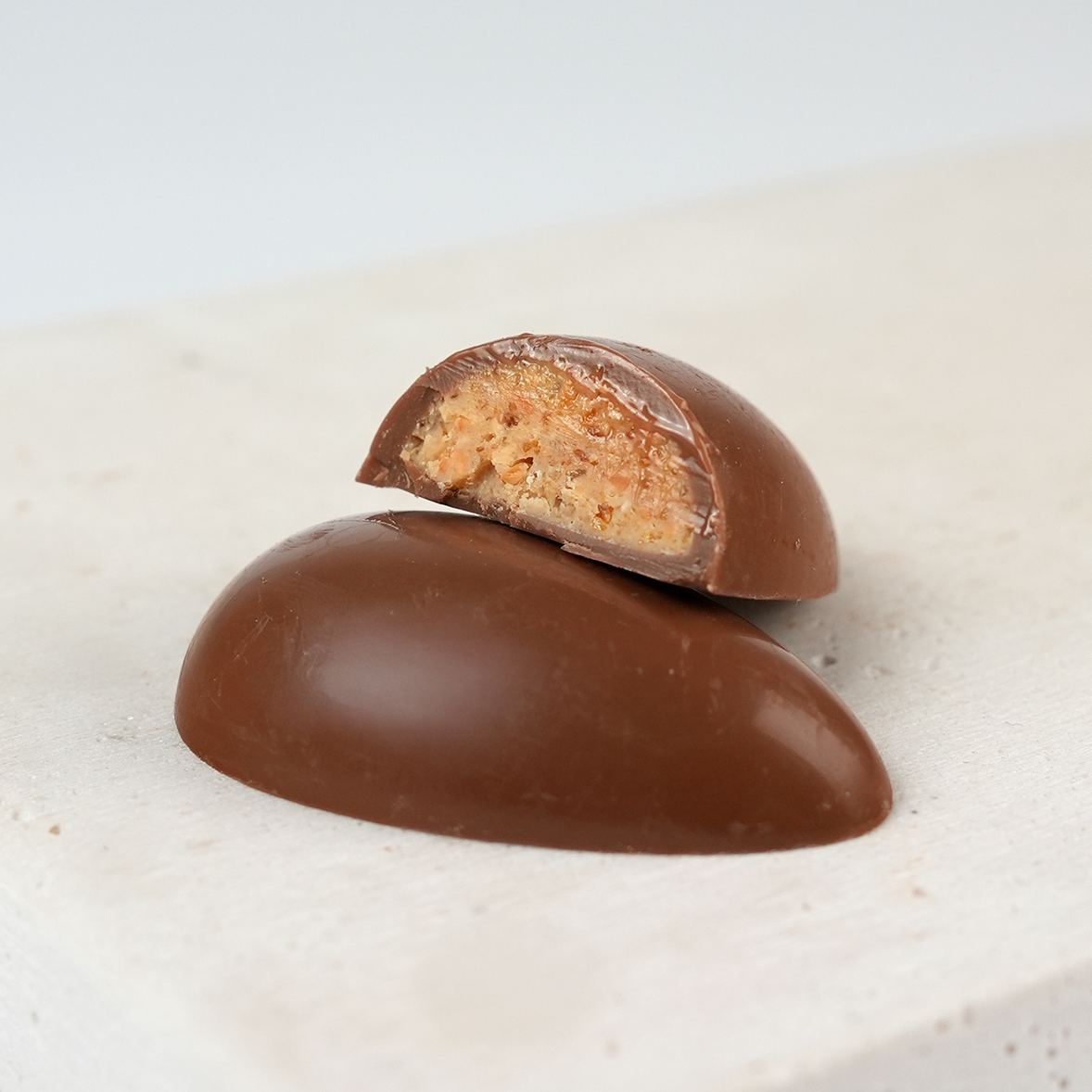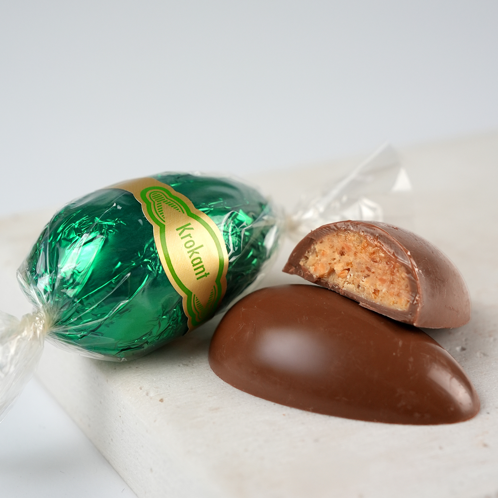 Das Dessert-Ei Krokant überzeugt mit der perfekten Balance aus zart schmelzender Schokolade und knusprigen Krokantstückchen. Die karamellisierte Textur verleiht dieser Sorte einen ganz besonderen Biss.