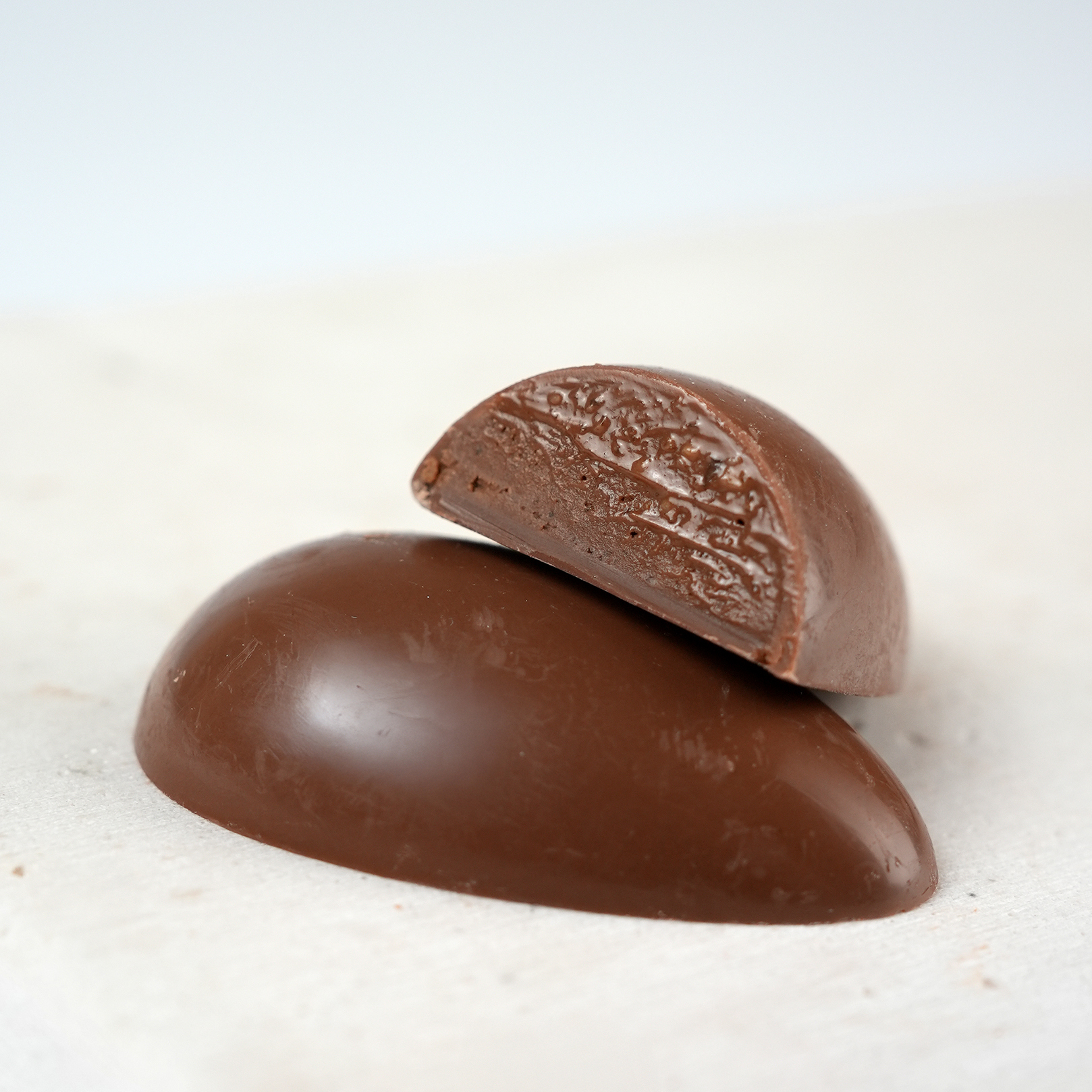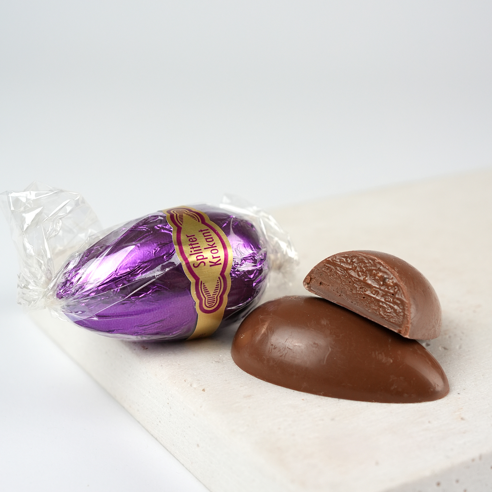 Dieses Dessert-Ei kombiniert die Cremigkeit der Vollmilchkuvertüre mit der Raffinesse von Splitter-Krokant. Die feinen, karamellisierten Splitter sorgen für ein aufregendes Mundgefühl und einen intensiven Geschmack.